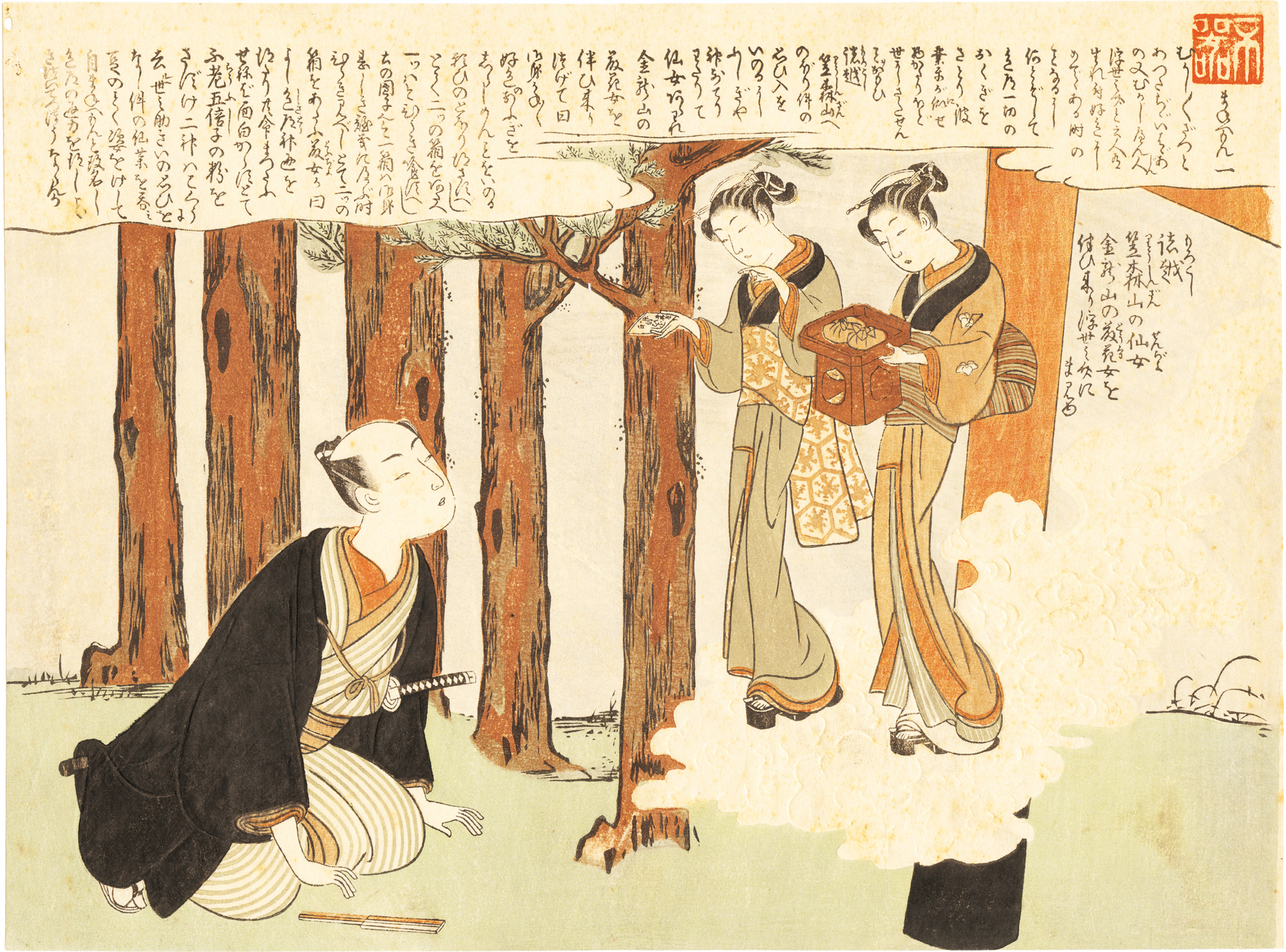 Suzuki Harunobu was an innovator, the first to produce full-color prints 1765, rendering obsolete the former modes of two- and three-color prints. Harunobu used many special techniques and depicted a wide variety of subjects, from classical poems to contemporary beauties. Like many artists of his day, Harunobu also produced a number of shunga, or erotic images. During his lifetime and shortly afterward, many artists imitated his style.