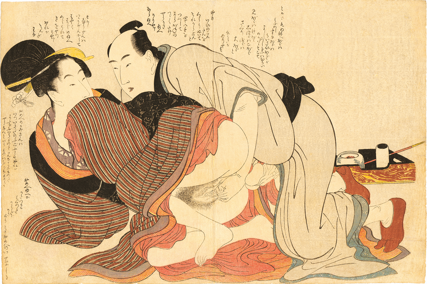 「歌まくら」は歌麿の上昇期に制作された意欲作であり大胆な構図や抑揚のある線描そして卓越なアイデアが冴えわたっており、春画の最高傑作との呼び声が高い。
