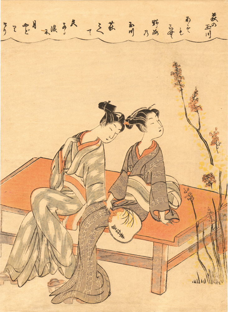 Suzuki Harunobu was an innovator, the first to produce full-color woodblock prints 1765, rendering obsolete the former modes of two- and three-color prints. Harunobu used many special techniques and depicted a wide variety of subjects, from classical poems to contemporary beauties. Like many artists of his day, Harunobu also produced a number of shunga or erotic images. During his lifetime and shortly afterward, many artists imitated his style.