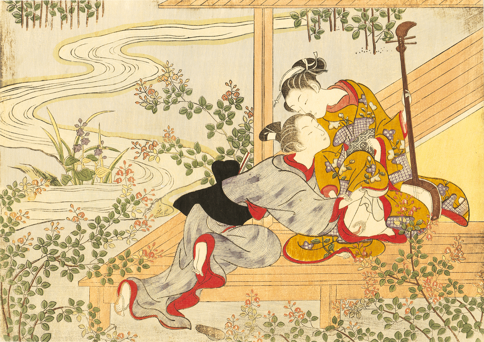 Suzuki Harunobu was an innovator, the first to produce full-color woodblock prints 1765, rendering obsolete the former modes of two- and three-color prints. Harunobu used many special techniques and depicted a wide variety of subjects, from classical poems to contemporary beauties. Like many artists of his day, Harunobu also produced a number of shunga or erotic images. During his lifetime and shortly afterward, many artists imitated his style.