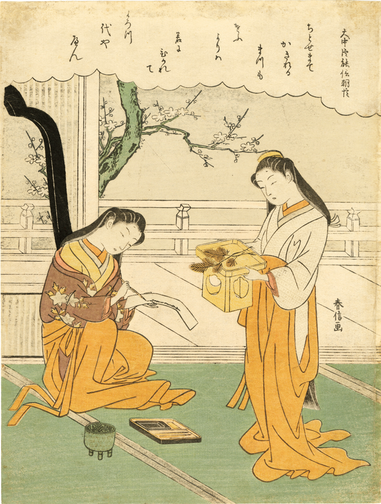 Suzuki Harunobu was an innovator, the first to produce full-color woodblock prints 1765, rendering obsolete the former modes of two- and three-color prints. Harunobu used many special techniques and depicted a wide variety of subjects, from classical poems to contemporary beauties. Like many artists of his day, Harunobu also produced a number of shunga, or erotic images. During his lifetime and shortly afterward, many artists imitated his style.