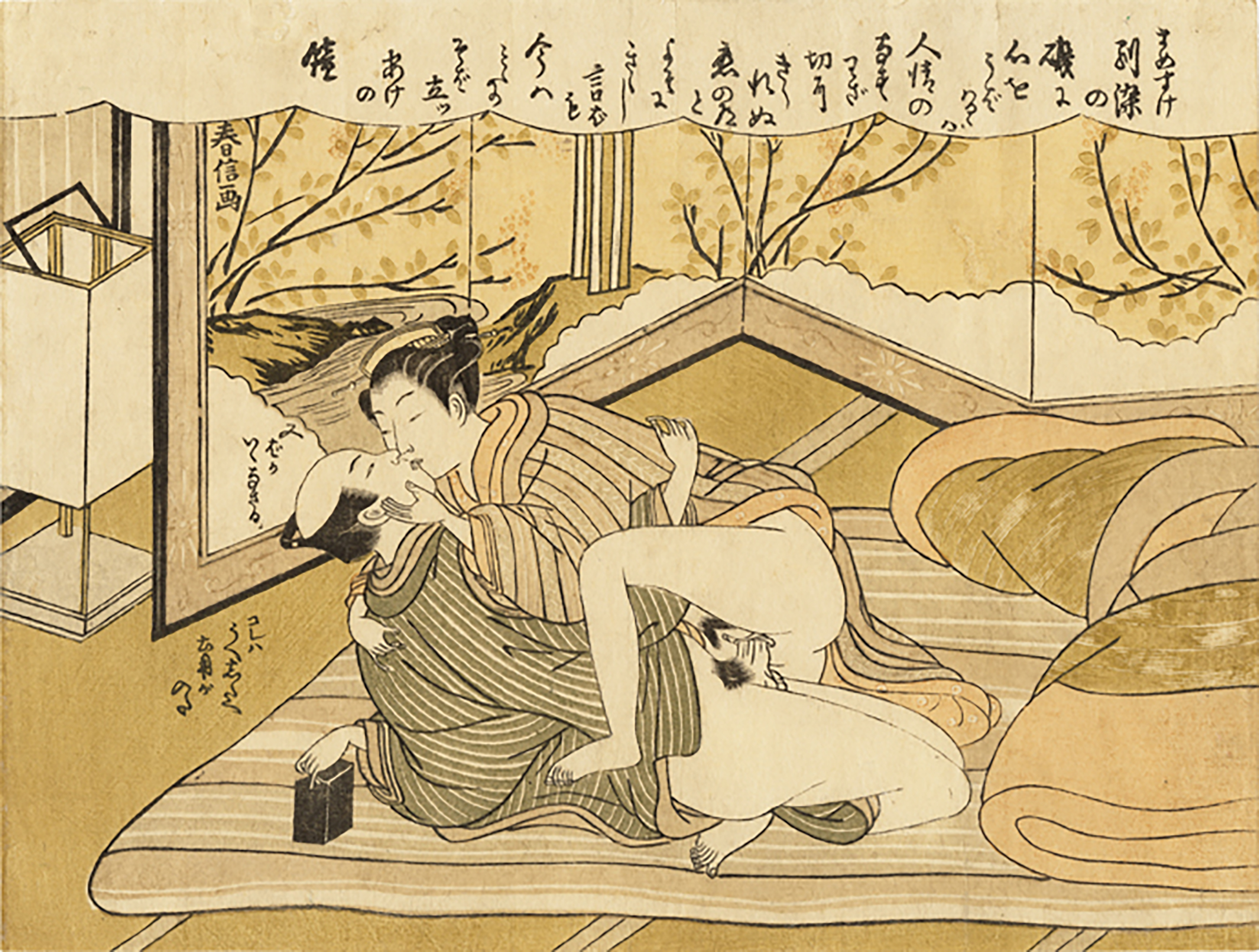Suzuki Harunobu was an innovator, the first to produce full-color woodblock prints 1765, rendering obsolete the former modes of two- and three-color prints. Harunobu used many special techniques and depicted a wide variety of subjects, from classical poems to contemporary beauties. Like many artists of his day, Harunobu also produced a number of shunga or erotic images. During his lifetime and shortly afterward, many artists imitated his style.