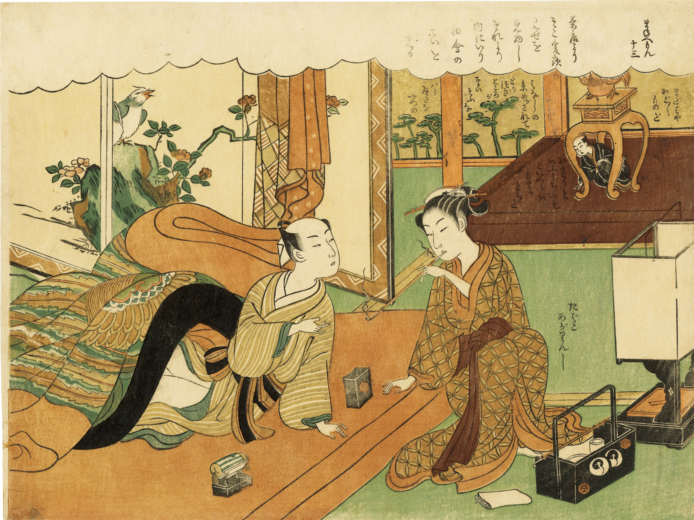 Suzuki Harunobu was an innovator, the first to produce full-color prints in 1765, rendering obsolete the former modes of two- and three-color prints. Harunobu used many special techniques and depicted various subjects, from classical poems to contemporary beauties. Like many artists of his day, Harunobu also produced a lot of shunga. During his lifetime and shortly afterward, many artists imitated his style.