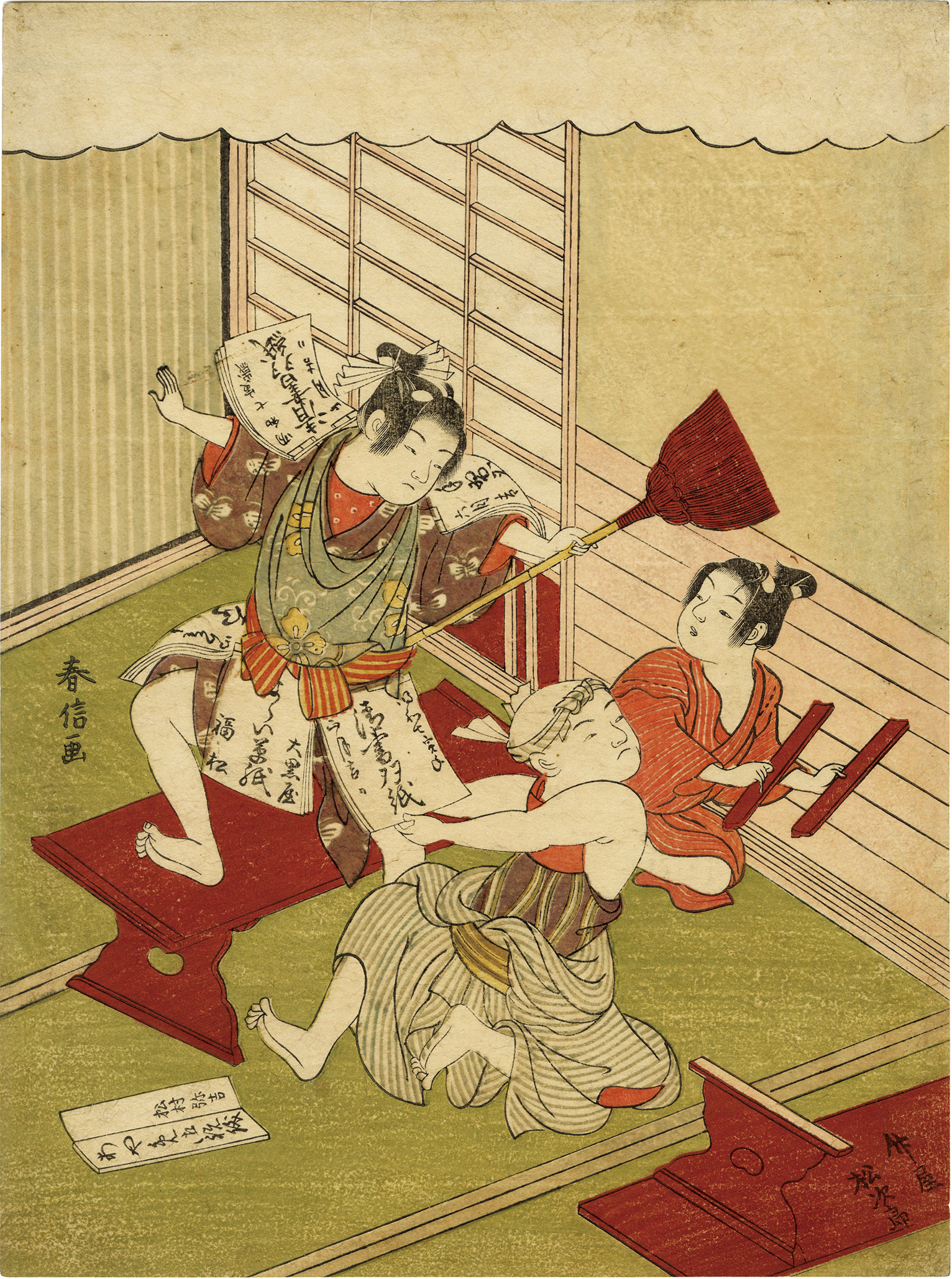 Harunobu played a decisive role in the birth of multicolored nishiki-e prints and had a profound influence on the later development of ukiyo-e. He gained great popularity for his delicate and charming beautiful women. The number of his surviving works is estimated to be around 1,000. Compared to later popular ukiyo-e artists, the number of remaining prints per design is relatively small, and many of his major works are held overseas.