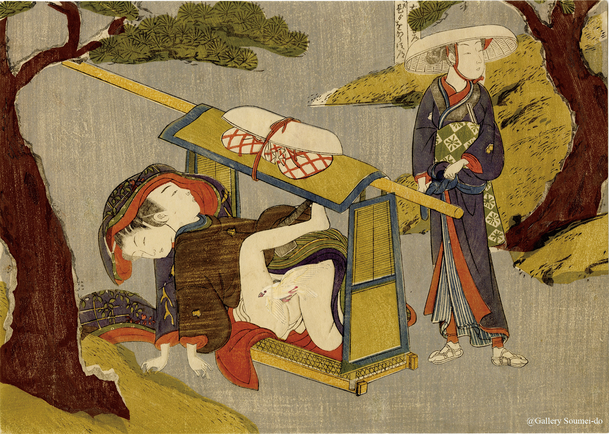 Suzuki Harunobu was an innovator, the first to produce full-color prints in 1765, rendering obsolete the former modes of two- and three-color prints. Harunobu used many special techniques and depicted various subjects, from classical poems to contemporary beauties. Like many artists of his day, Harunobu also produced a lot of shunga. During his lifetime and shortly afterward, many artists imitated his style.