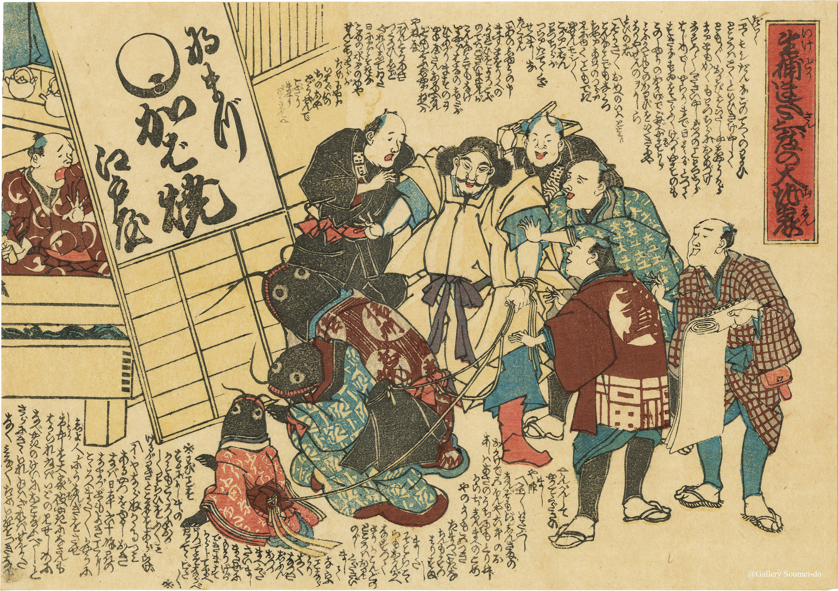 At the time, it was believed that catfish caused earthquakes. The painting depicts the scene where Kashima Daimyojin, having captured three live catfish, tied ropes around them and was leading them to a grilled fish restaurant called Edo-ya, while five men—a carpenter, a scaffolder, a plasterer, a roofer, and a street vendor—who profited every time an earthquake struck, were pleading with him to spare the fish. Shopping Guide & Information"