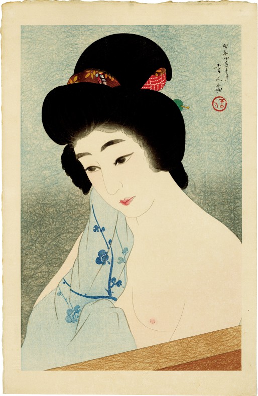 鳥居言人は、大正から昭和期に活躍した新版画の美人画家で、華やかさよりも上品で繊細な女性表現に定評があります。言人は歌舞伎役者絵や絵看板を描き継ぐ、鳥居派の絵師ですが、清方に師事して美人画を学びました。