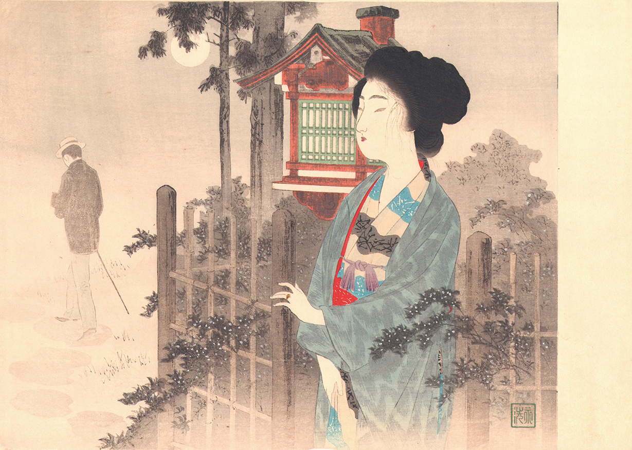 永洗は永濯の門下で画業の傍ら挿絵も手がけ、艶やかな美人画で評判を得た。その画風は、当時における流行の一典型を成したとも言われ、後の鏑木清方にも影響を与えている。また時代物にしろ現代ものにしろ、特異な人物を描くことに定評があった。