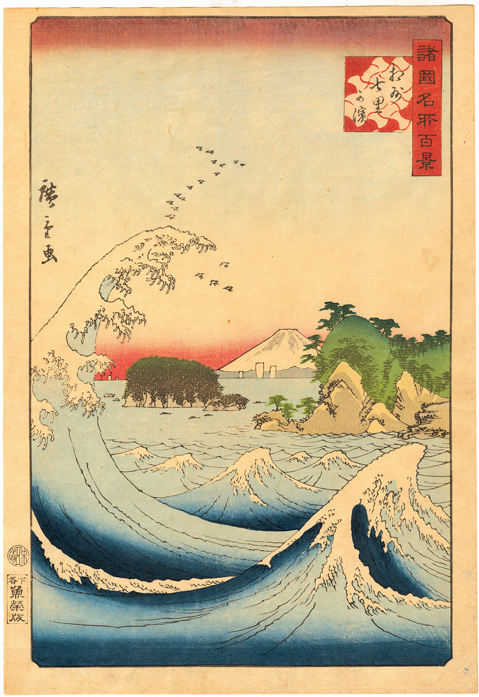 広重二代の代表作が「諸国名所百景」で日本全国の名勝・名跡が描かれている。広重二代は広重の六十余州名所図会などを参考にしつつ、異国船や外国人といった最幕末の浮世絵師らしいモチーフを時折加えながら、日本の美しい風景を独自の視線で描いている。