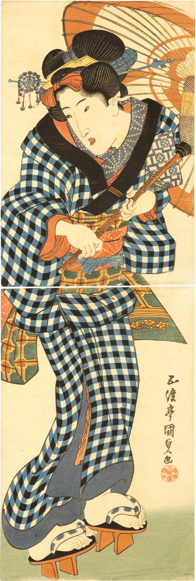 Kunisada (1786 – 1865), also known as Toyokuni III, was the most popular, prolific, and commercially successful artist of ukiyo-e woodblock prints in 19th-century Japan. In his own time, his reputation far exceeded that of his contemporaries, Hokusai, Hiroshige, and Kuniyoshi.