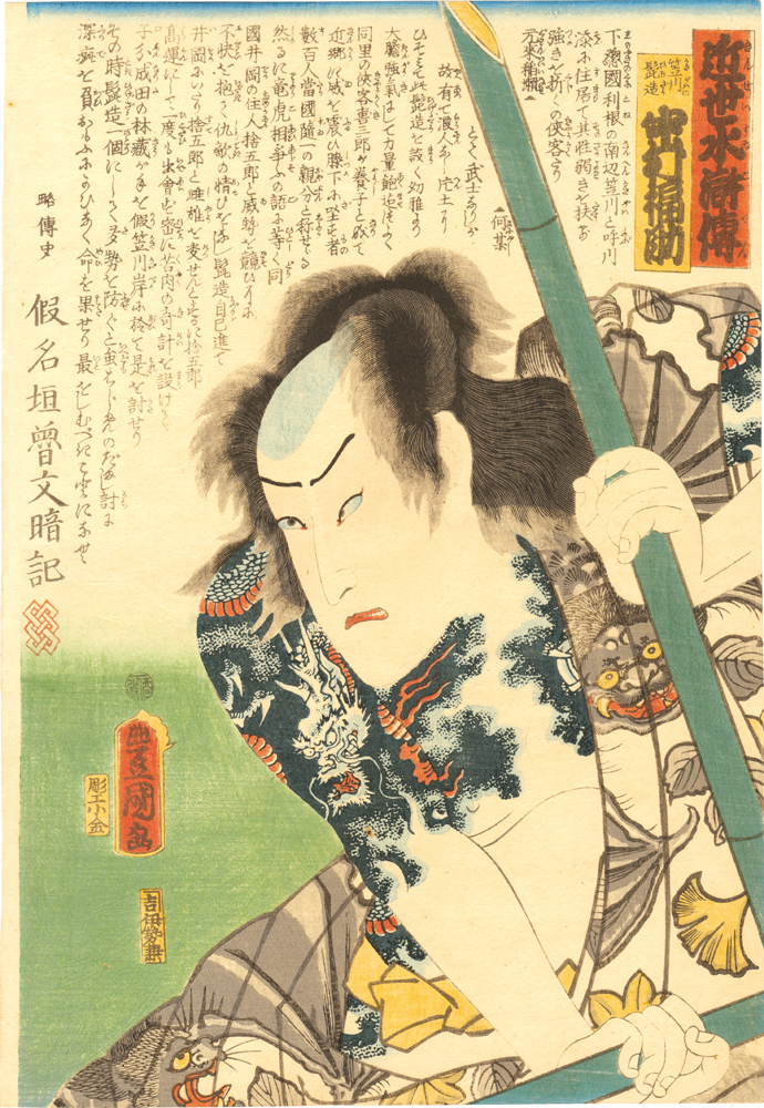 江戸時代には水滸伝ブームが巻きおこったが、その背景には、日本のアウトロー、博徒・侠客の蠢動があった。「近世水滸伝」は水滸伝の豪傑を日本の侠客に見立てた役者絵の連作であり、組定重次(国定忠治)らの男伊達が登場することになった。