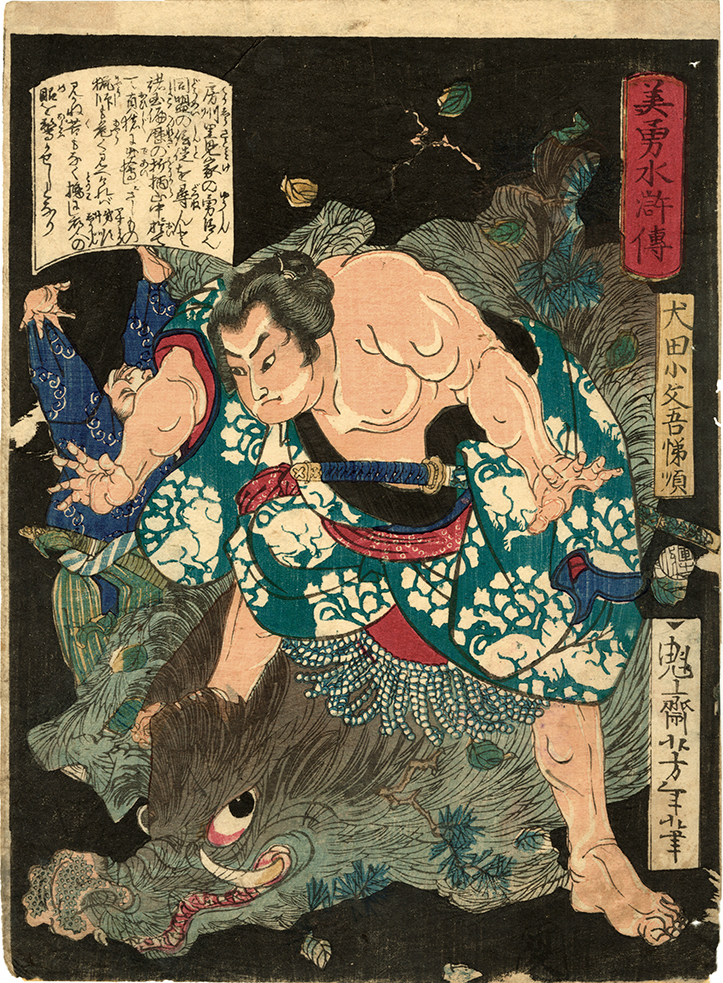Yoshitoshi / Inuta Kobungo Yasuyori Vanquishing a Boar, Beauty and Valour in the Suikoden