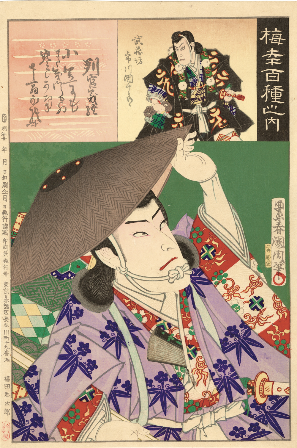 国周は周信及び豊国三代の門人で、小島烏水によって「明治の写楽」と称せられる。3枚続に役者一人を描くという新しい構成は国周が創始したとされる。明治期における役者絵浮世絵師の代表的存在であり、作品数も多く、明治演劇史の資料としても大変価値がある。