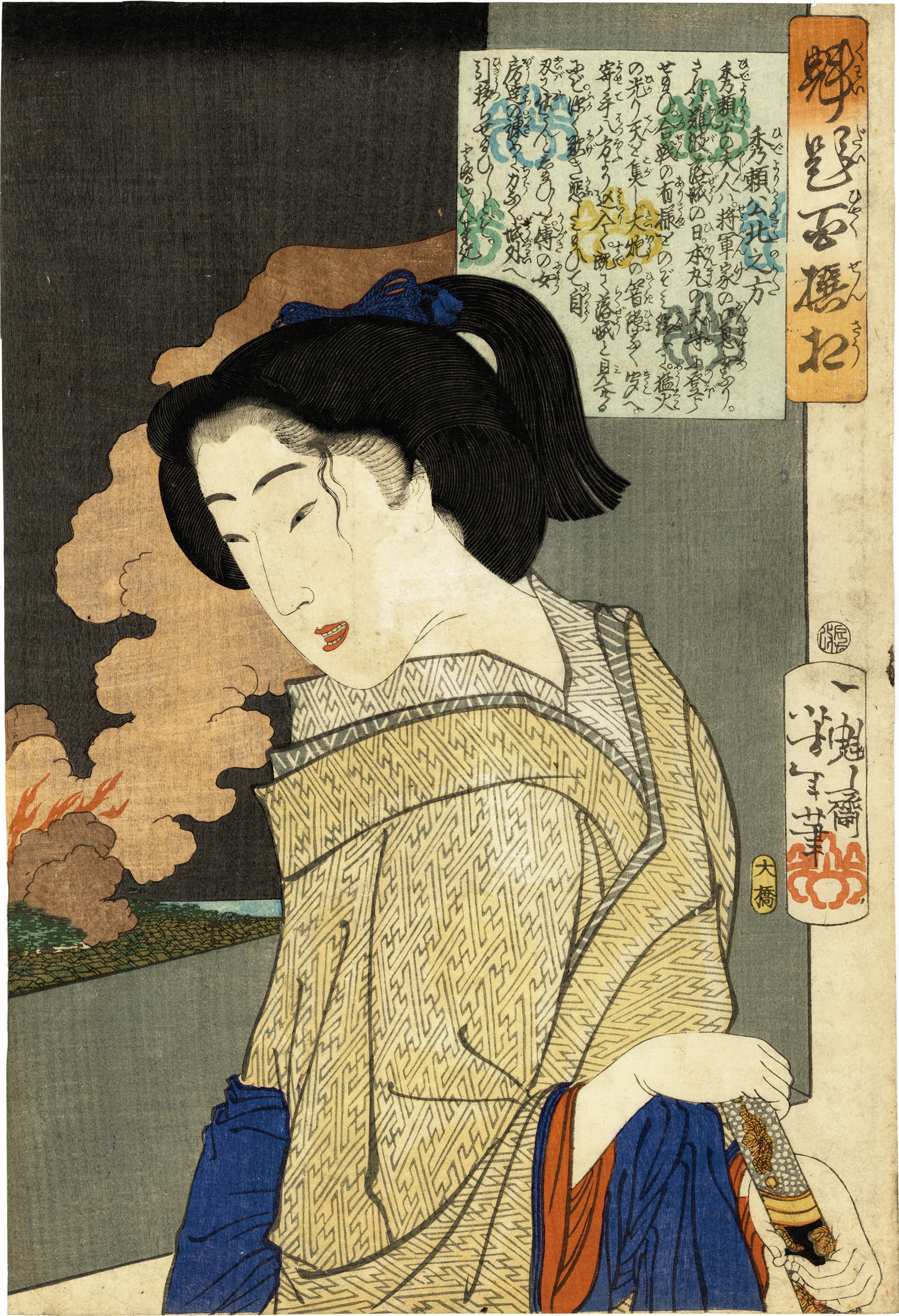 「魁題百撰相」の題名は「海内百戦争」の語呂合わせになっており、芳年が百人の相貌を選んで題すという意味を表している。古今の英雄たちの名を借りているが、実際は見立絵で彰義隊の壮絶な戦いを描いている。