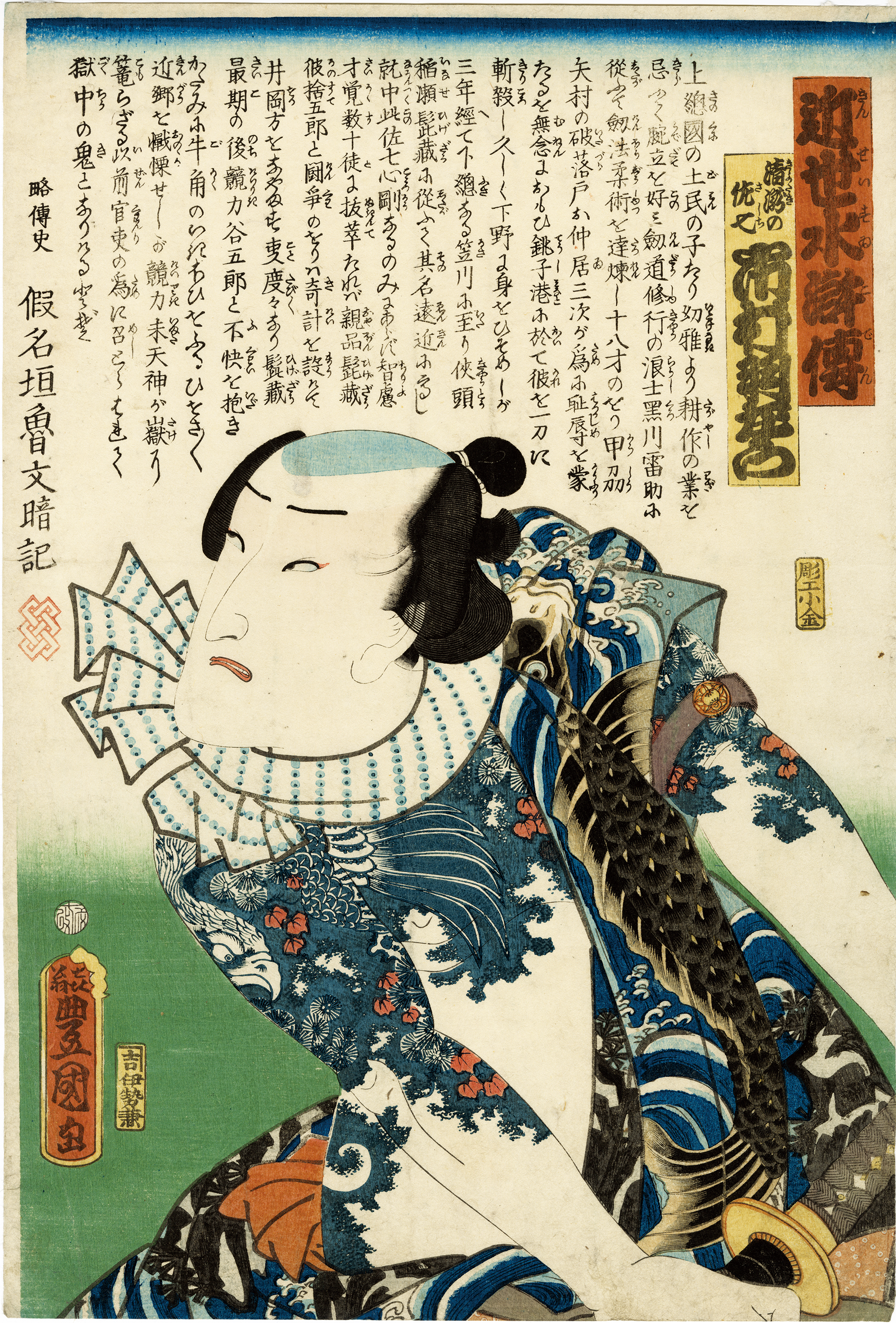 江戸時代には水滸伝ブームが巻きおこったが、その背景には、日本のアウトロー、博徒・侠客の蠢動があった。「近世水滸伝」は水滸伝の豪傑を日本の侠客に見立てた役者絵の連作であり、組定重次(国定忠治)らの男伊達が登場することになった。
