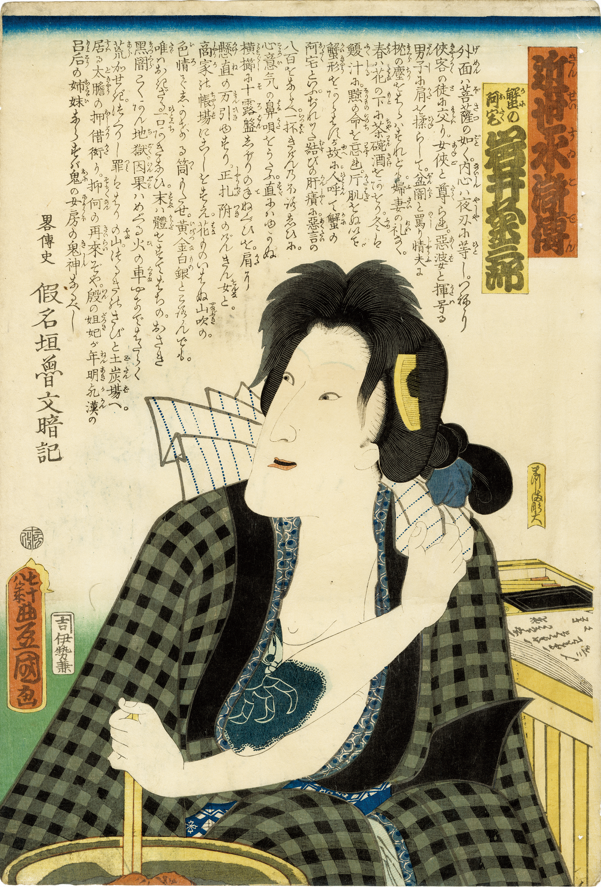 Kunisada (1786 – 1865), also known as Toyokuni III, was the most popular, prolific, and commercially successful artist of ukiyo-e woodblock prints in 19th-century Japan. In his own time, his reputation far exceeded that of his contemporaries, Hokusai, Hiroshige, and Kuniyoshi.