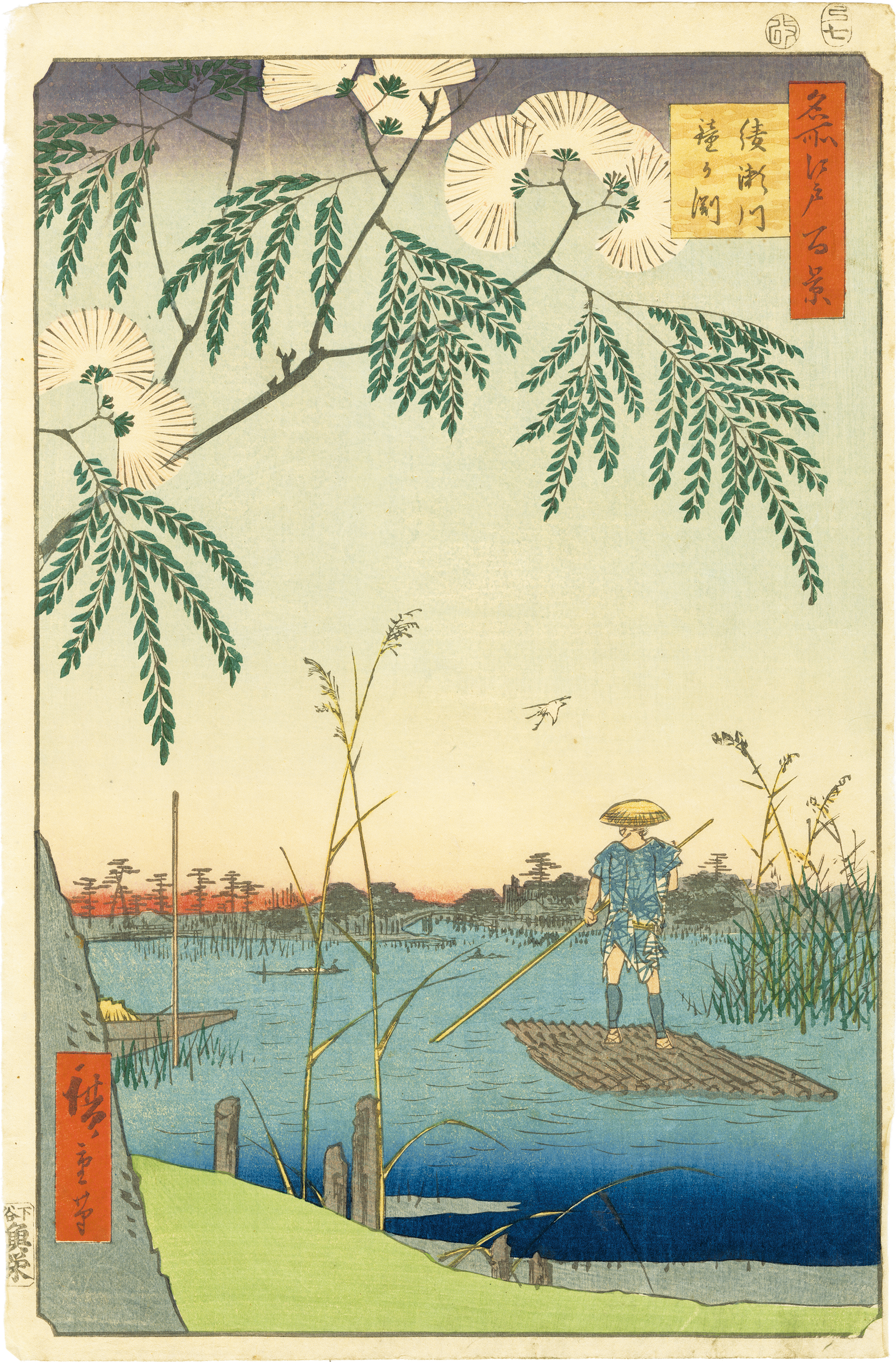 The contrast of the albizia julibrissin in the close-range view and Kanegafuchi in the distant view. We can see the attractive characteristic of Hiroshige's landscape work from them.
