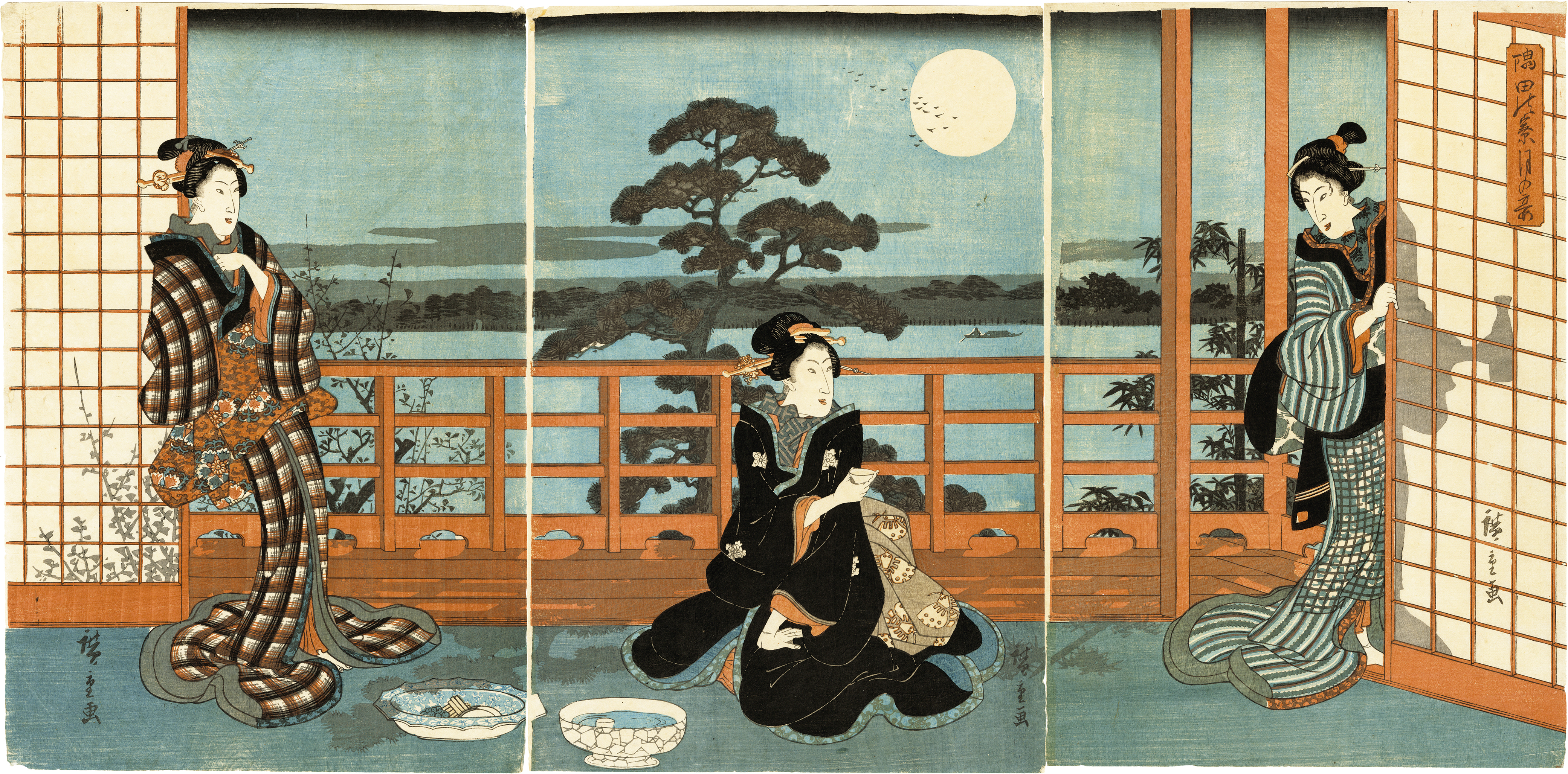 夜の隅田川に浮かぶ月を前に宴会が開かれている。美しい満月を見ながらすでにお酒は底をついたようで、中図の女性はもう一杯ご所望の様子。雲一つない夜空の満月は縁側や障子に影を作り、画面の隅々まで広重の遊び心が窺える。