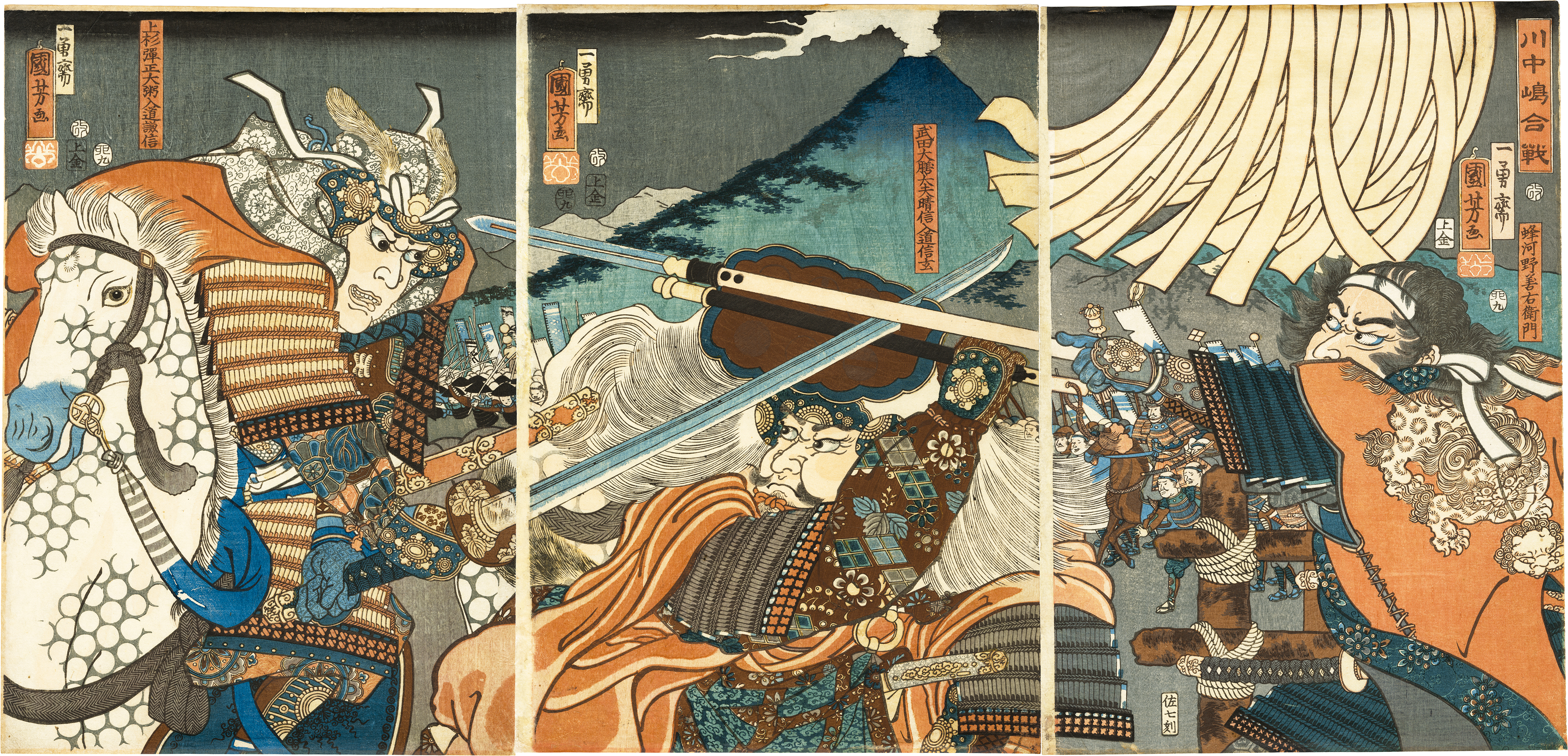 川中島の戦いは 1553 年(天文 22 年)~ 1564 年(永禄 7 年)にかけて、「武田信玄」と「上杉謙信」の間で 5 回行なわれた。作品には 1561 年(永禄 4 年)の第 4 次「川中島の戦い」が描かれている。合戦のさなか、「武田信玄」と「上杉謙信」両陣営の旗本が入り乱れての大混戦となる。武田信玄の身辺が手薄になったと見て、上杉謙信は風のように武田信玄の本陣へ切り込んでいく。馬を駆る上杉謙信の勇猛果敢な姿が描かれ、川中島の戦いで一番の名場面と言われている。