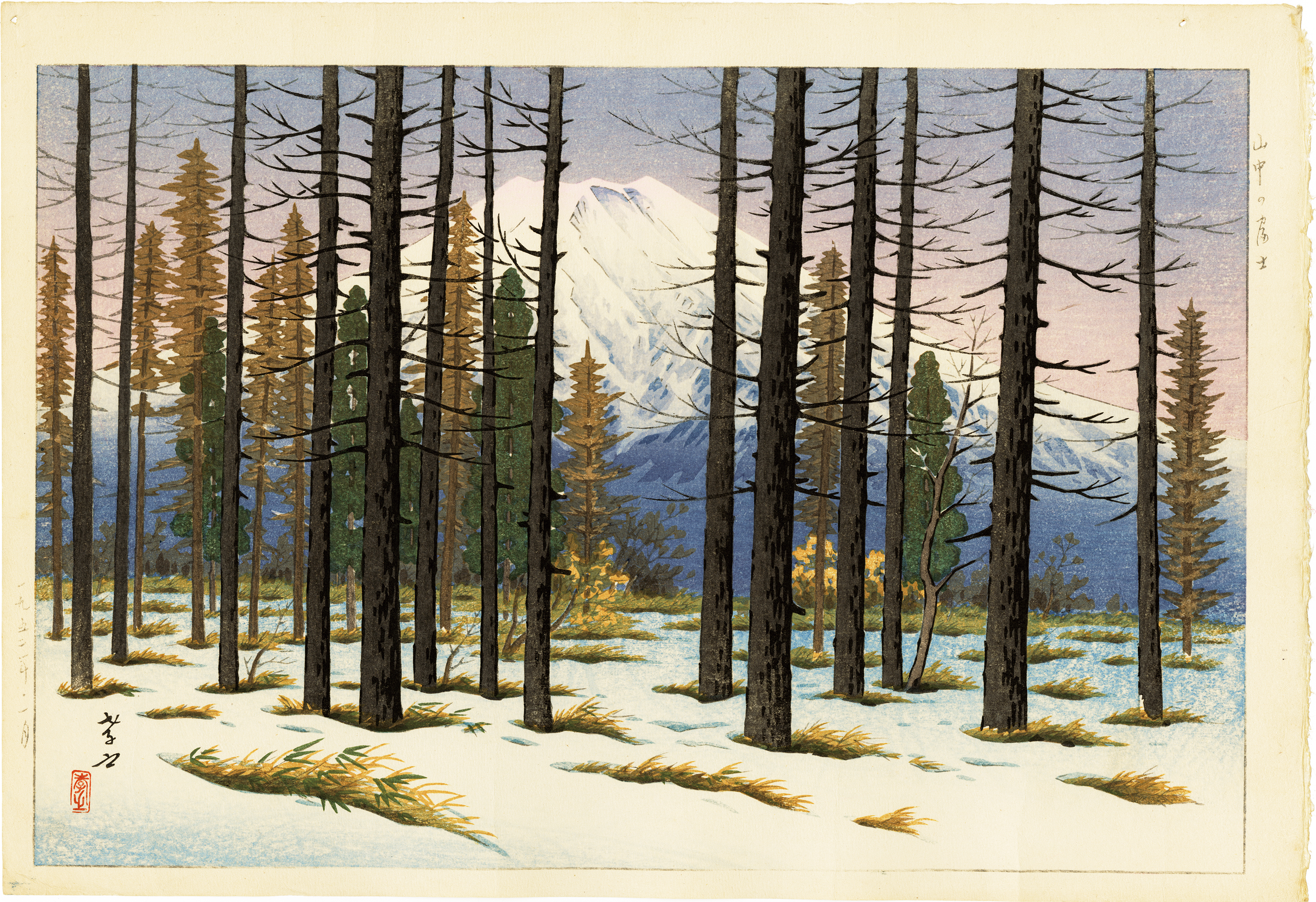 雪の山中、木々の間から雄大な富士を臨む。長い冬は終わりにさしかかり、地面には既に僅かな春の訪れ。美しい朝焼けの空の下、澄み切った朝の空気も感じられる気持ちの良い1枚である。