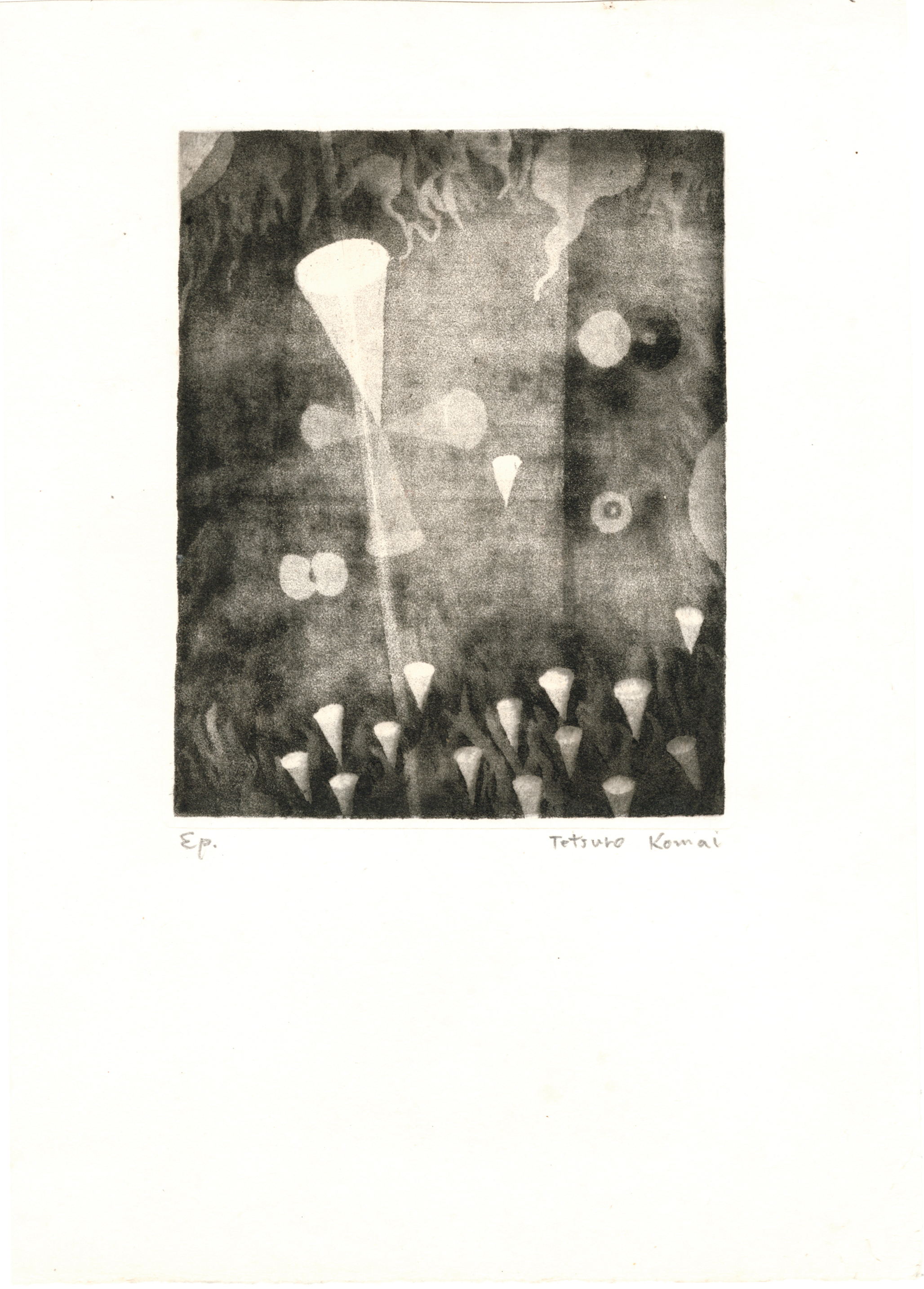 駒井哲郎は西田武雄に銅版画を学び、50年春陽会賞、翌年第1回サンパウロ・ビエンナ-レで受賞。木版の棟方志功とともにいち早く世界の舞台で高い評価を獲得し、戦後の美術界に鮮烈なデビューを飾った。銅版画のパイオニアとして大きな足跡を残した。