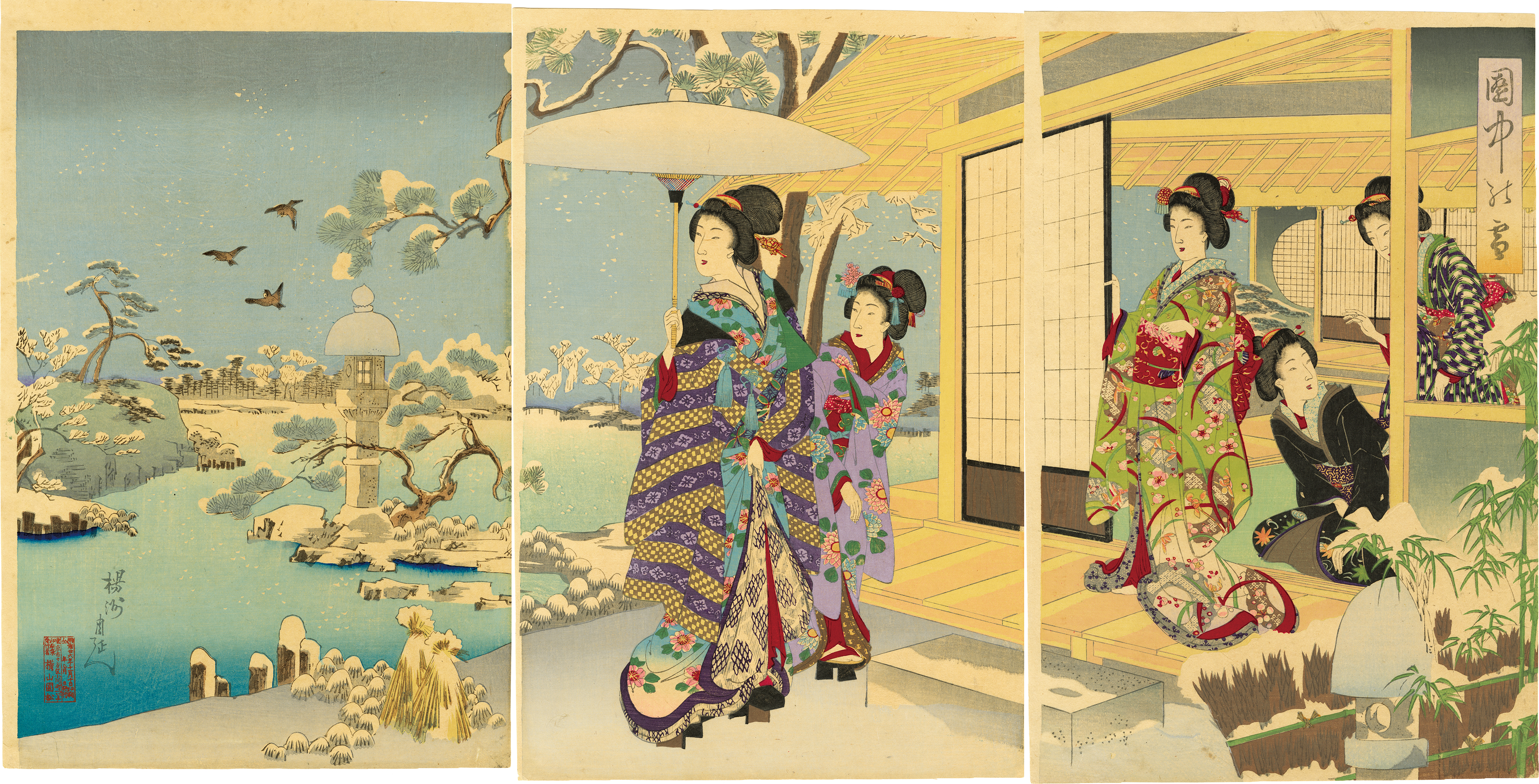 He was famous for the motif of beauties, however, one of the seeds that grow into a flowering of his art-life was the warrior prints and war prints of the Seinan War. After that, he started creating the artworks of Ooku, the shogun's harem, and the lady portrait in the civilization of the Meiji era. It raised his reputation. People had called his artworks "The second Edo Ukiyo-e", and he was one of the most popular artists whose motif is beauties.