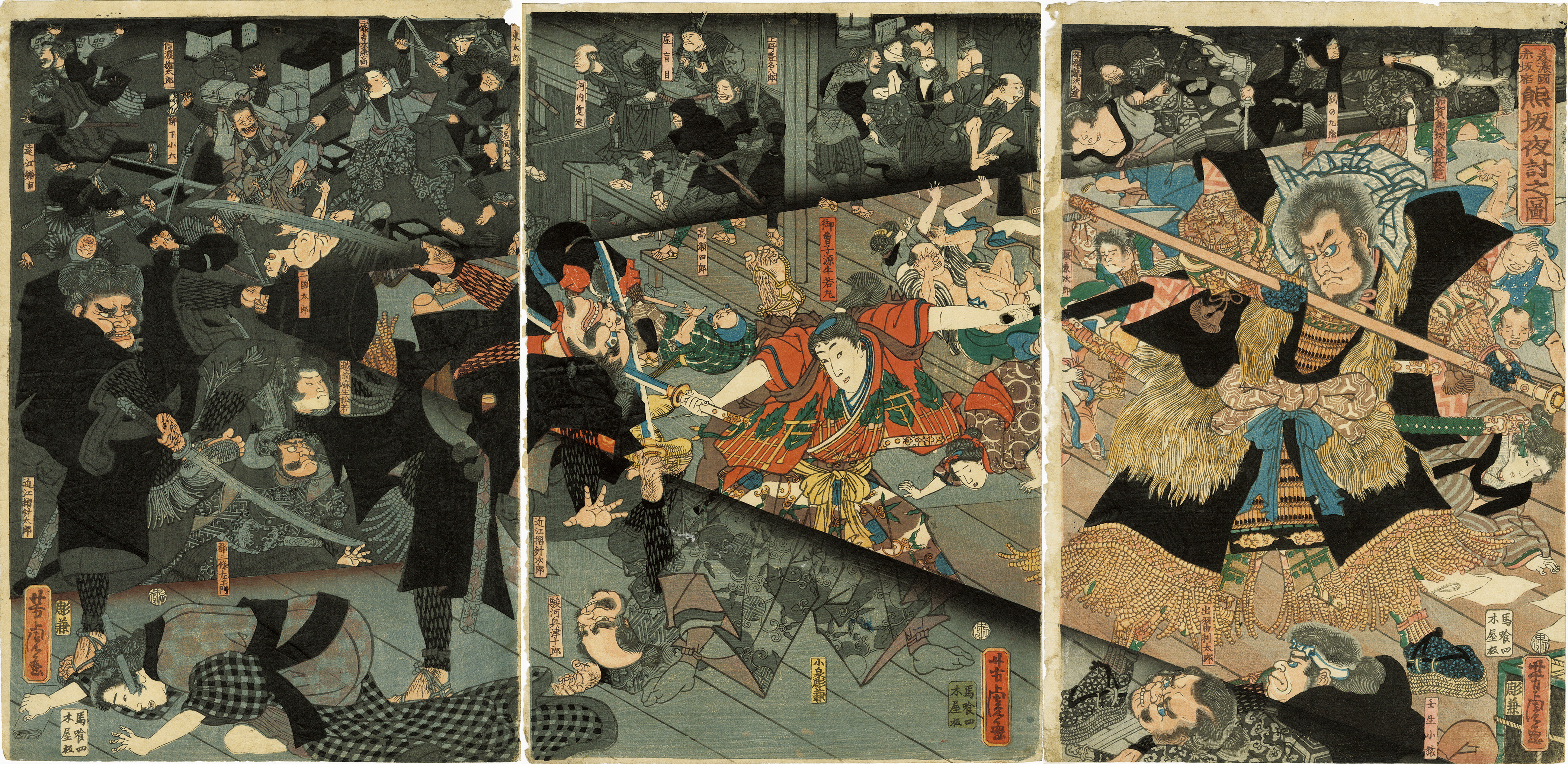 まず目に留まるのは、このユニークな構図であろう。今まさに斬り合おうとする長範と牛若丸が、3図にわたってのびる龕灯(がんとう)の光によって照らし出されている。