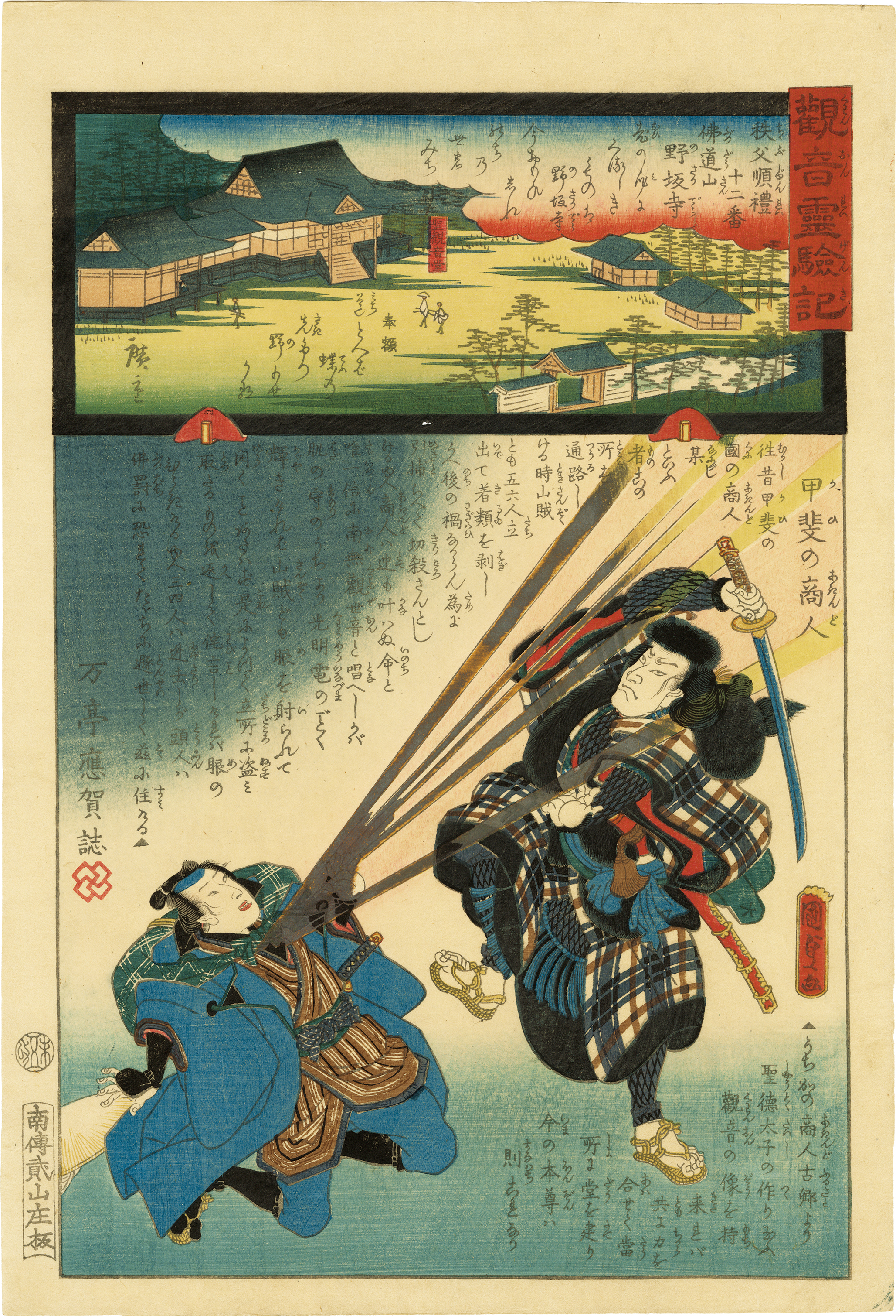 HiroshigeⅡ & KunisadaⅡ / No. 12, Merchant of Kai Province, Mt. Butsudo Nosaka-Dera Temple, Amazing Stories of Kannon Temples of Chichibu