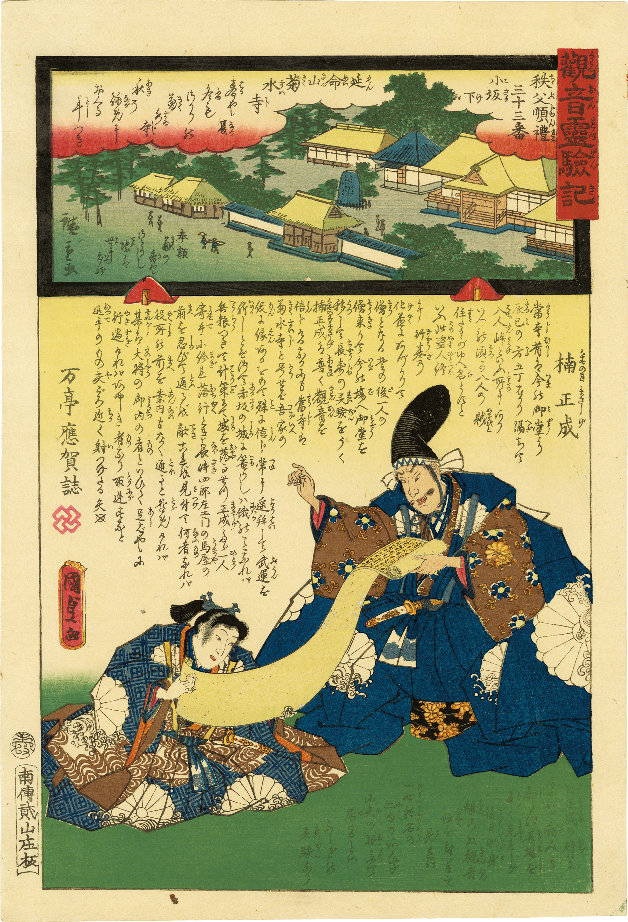 Hiroshige Ⅱ & Kunisada Ⅱ / No. 33, Kusunoki Masashige, Mt. Emmei Kikusui-Ji Temple Kosakage, Amazing Stories of Kannon Temples of Chichibu