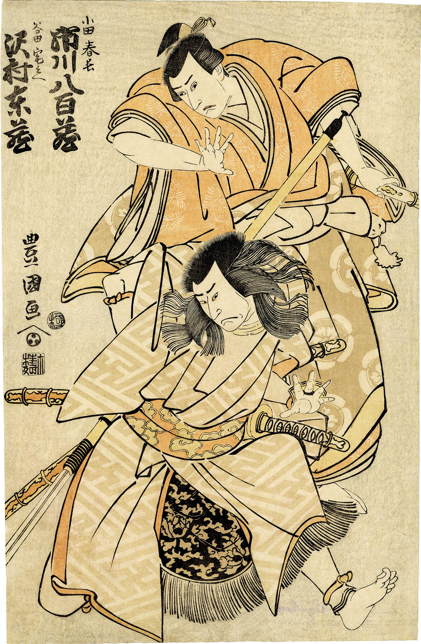 In this artwork, the artist hid names of real people in history in the written names "小田春長" and "谷田宅兵衛."