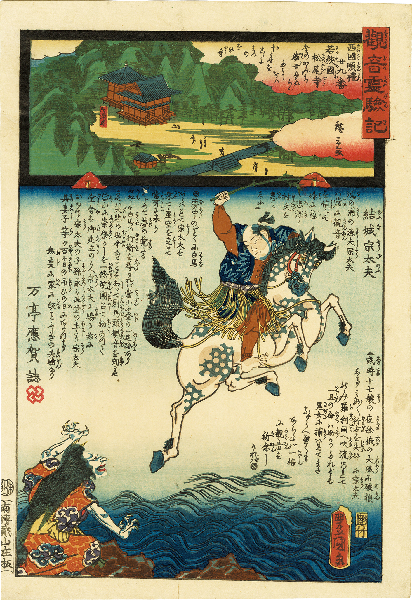 『観音霊験記 西国巡礼』は、西国に点在する観音霊場を関連する逸話と共に描いたシリーズ。上部に寺の境内の図が、下部に霊験の逸話が描かれている。