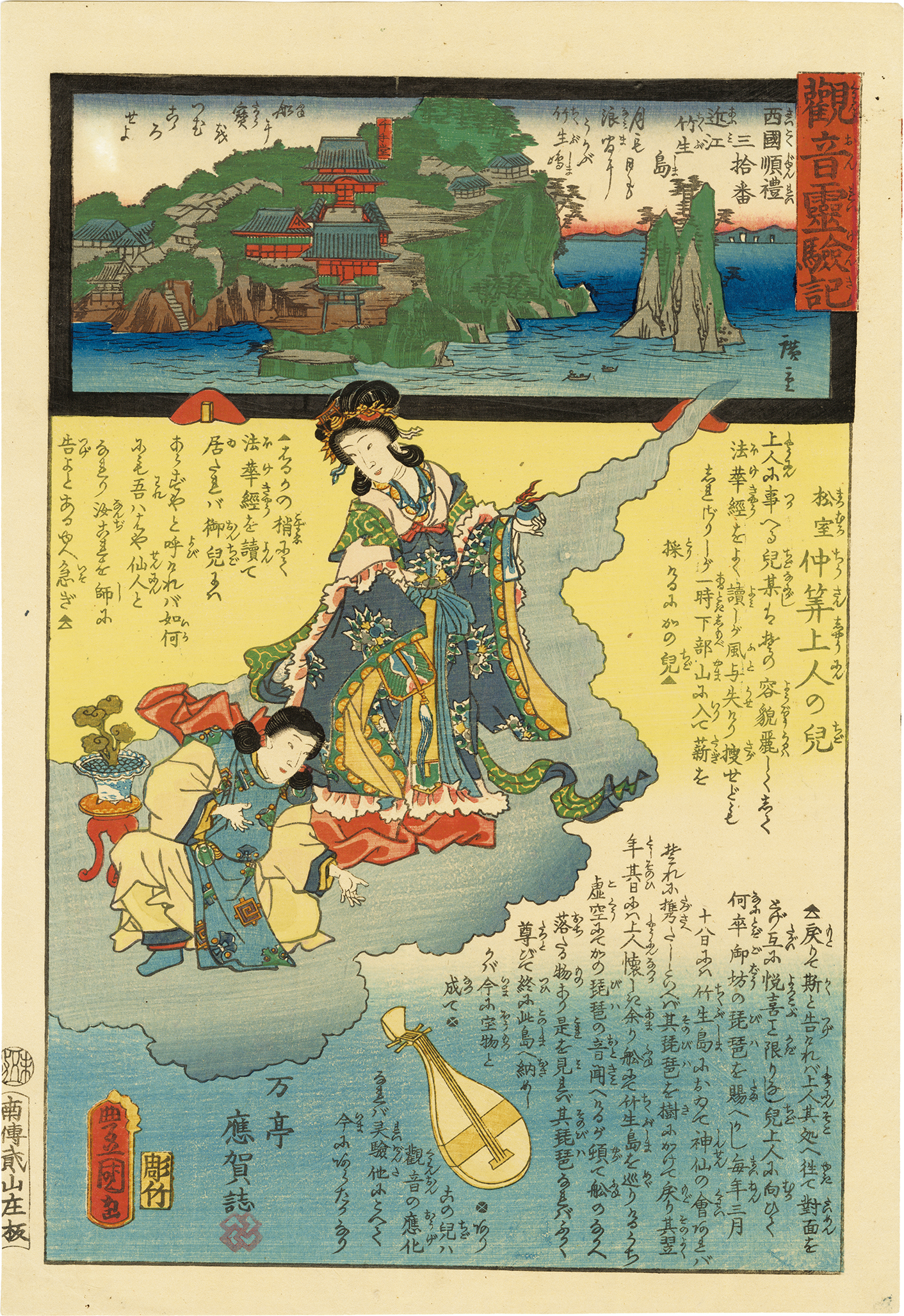 観音霊験記 西国巡礼は、西国に点在する観音霊場を関連する逸話と共に描いたシリーズ。上部に寺の境内の図が、下部に霊験の逸話が描かれている。