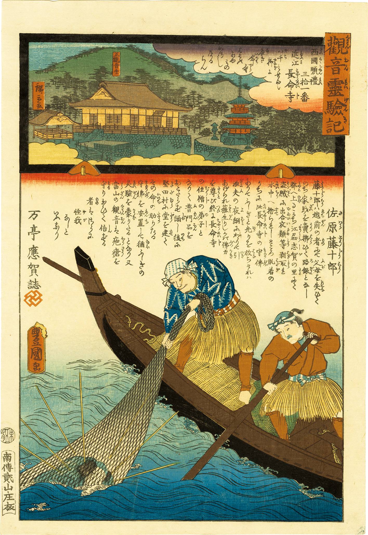 観音霊験記 西国巡礼は、西国に点在する観音霊場を関連する逸話と共に描いたシリーズ。上部に寺の境内の図が、下部に霊験の逸話が描かれている。