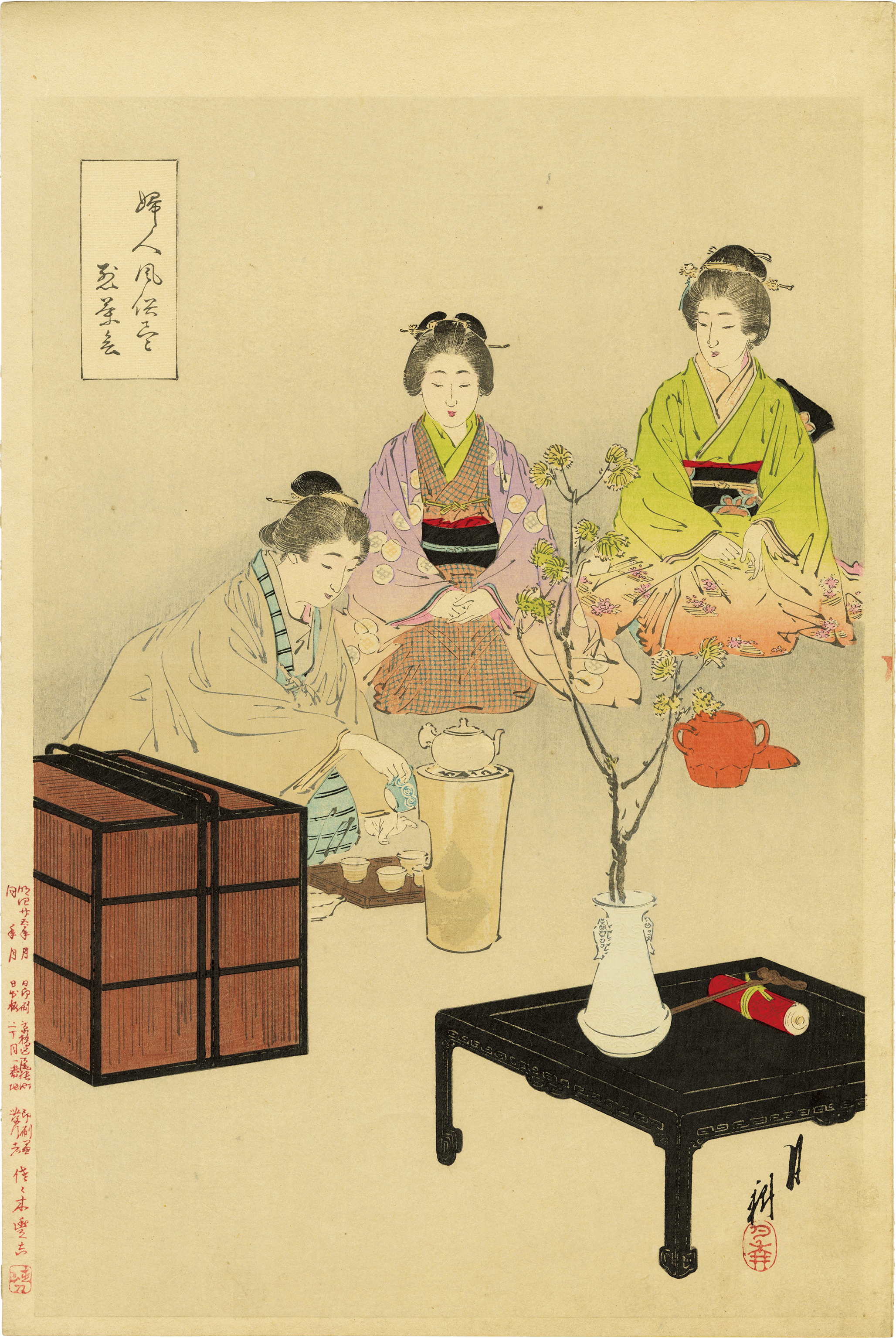Gekko learned the painting techniques by himself from the design work of the painting on the ceramic and lacquer. After the study, he started self-publishing in 1877, and it made him known little by little. From 1882, he started the work of Kuchi-e and illustration. After that, he became one of the most famous artists.