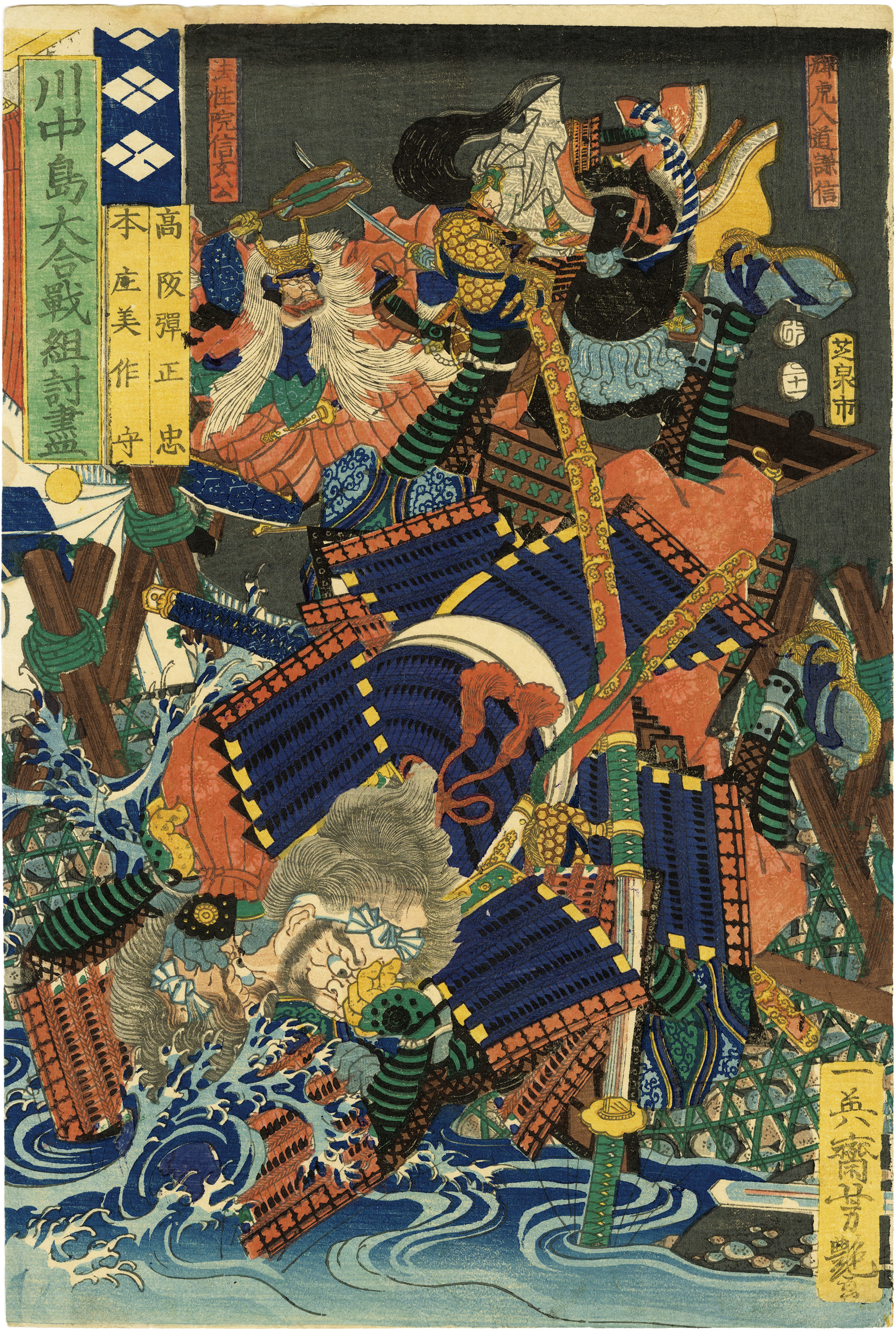 The battle was often depicted as the subject of ukiyo-e, and after the Minamimachi magistrate gave permission for publication during the Tempo period, Kuniyoshi and many other members of the Utagawa school created warrior prints of Kawanakajima.