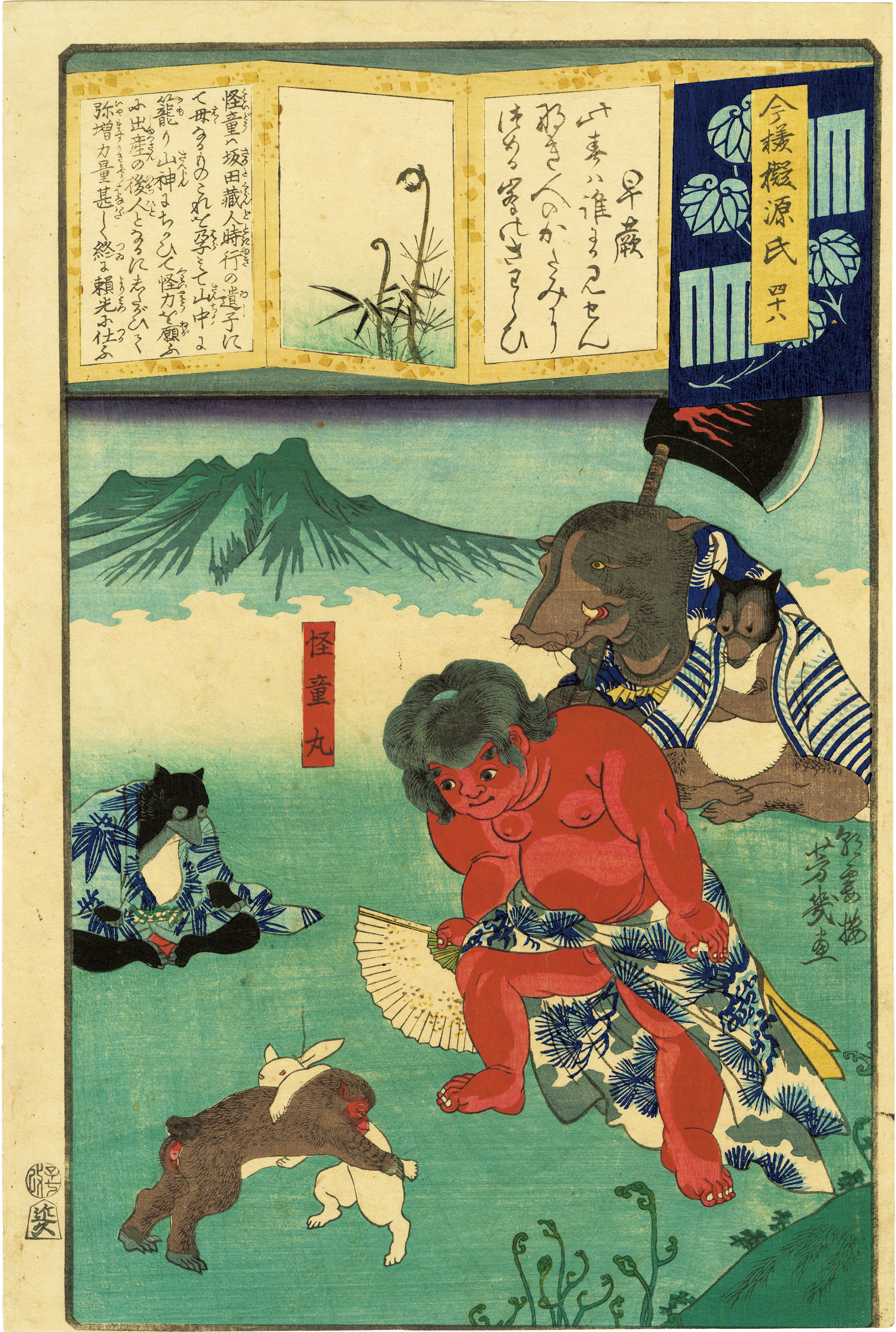 怪童丸は後の頼光四天王の一人である坂田公時(金時)の幼名で、昔話に登場する「金太郎」としても知られる。足柄山の山姥の息子として生まれた怪童丸は獣を友に育ち、その怪力を育んだ。