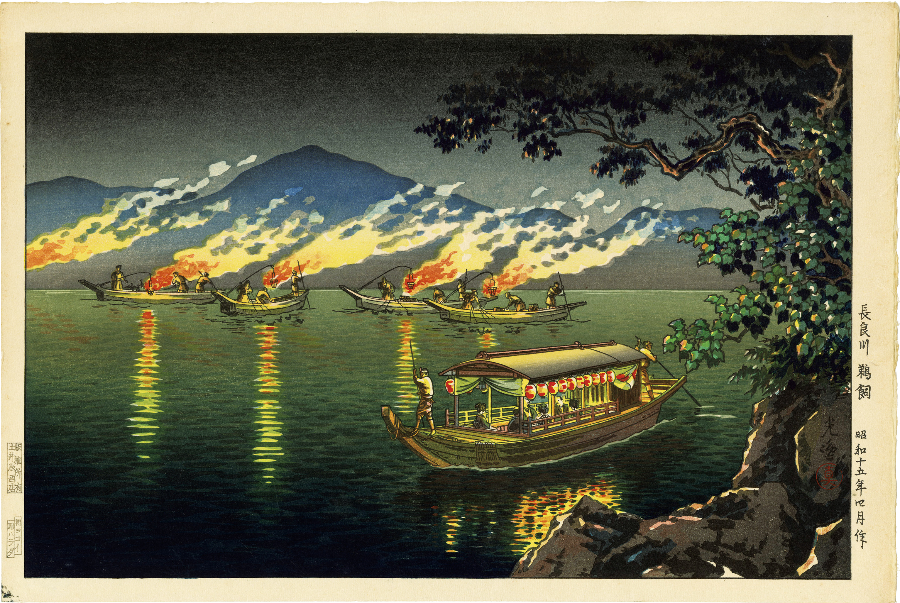 This work depicts a cormorant fishing event on the Nagara River under glowing fire.