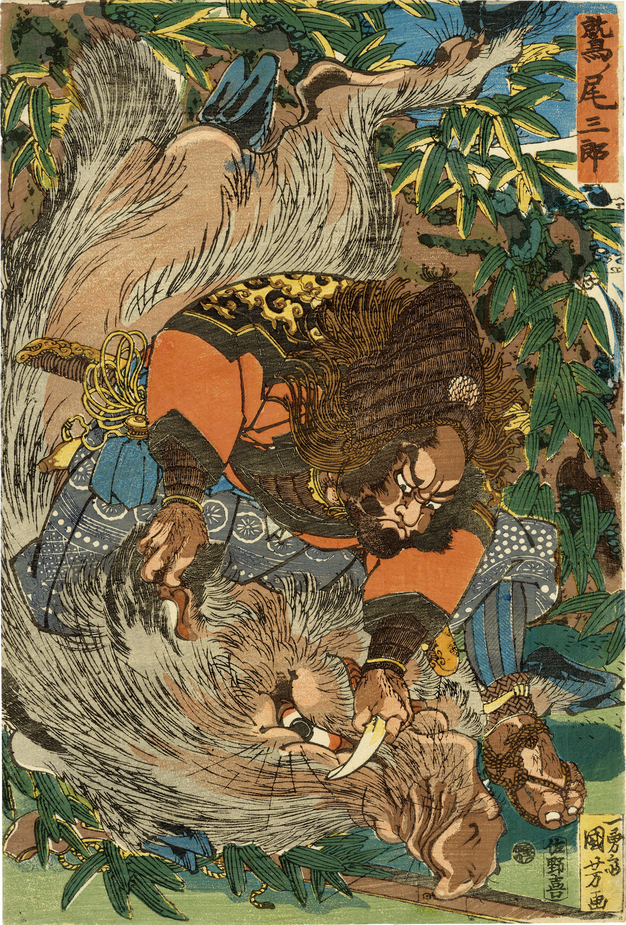 The giant boar is thrown down with great brilliance by Washio Yoshihisa, a warrior of the late Heian period (794-1185). His nickname was Saburo.