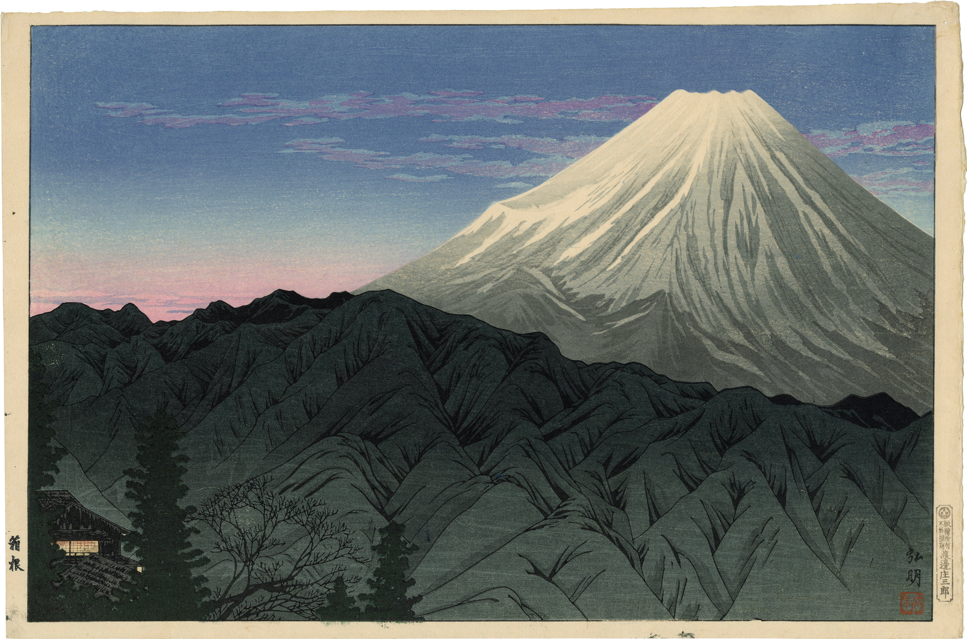 This print depicts Mt. Fuji seen from Hakone to the west at dusk, when people begin to turn on their lights. The sun setting behind it beautifully tints the sky.