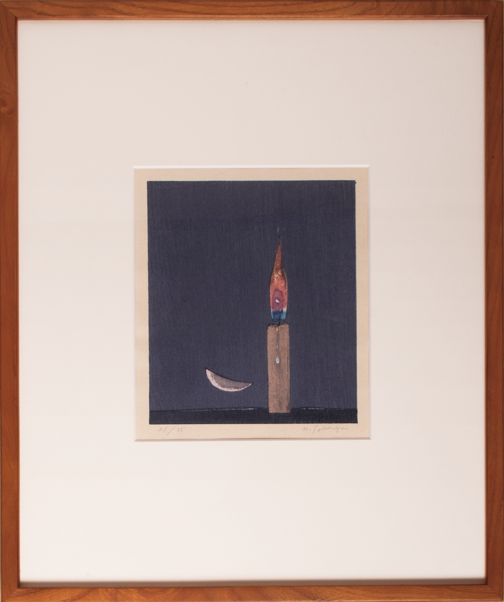 After working as an art teacher and commercial designer and experiencing the war, Seimiya Hirobumi (1917 - 1991) began to produce prints and glass paintings, perhaps under the influence of his father, Seimiya Hitoshi, a printmaker.