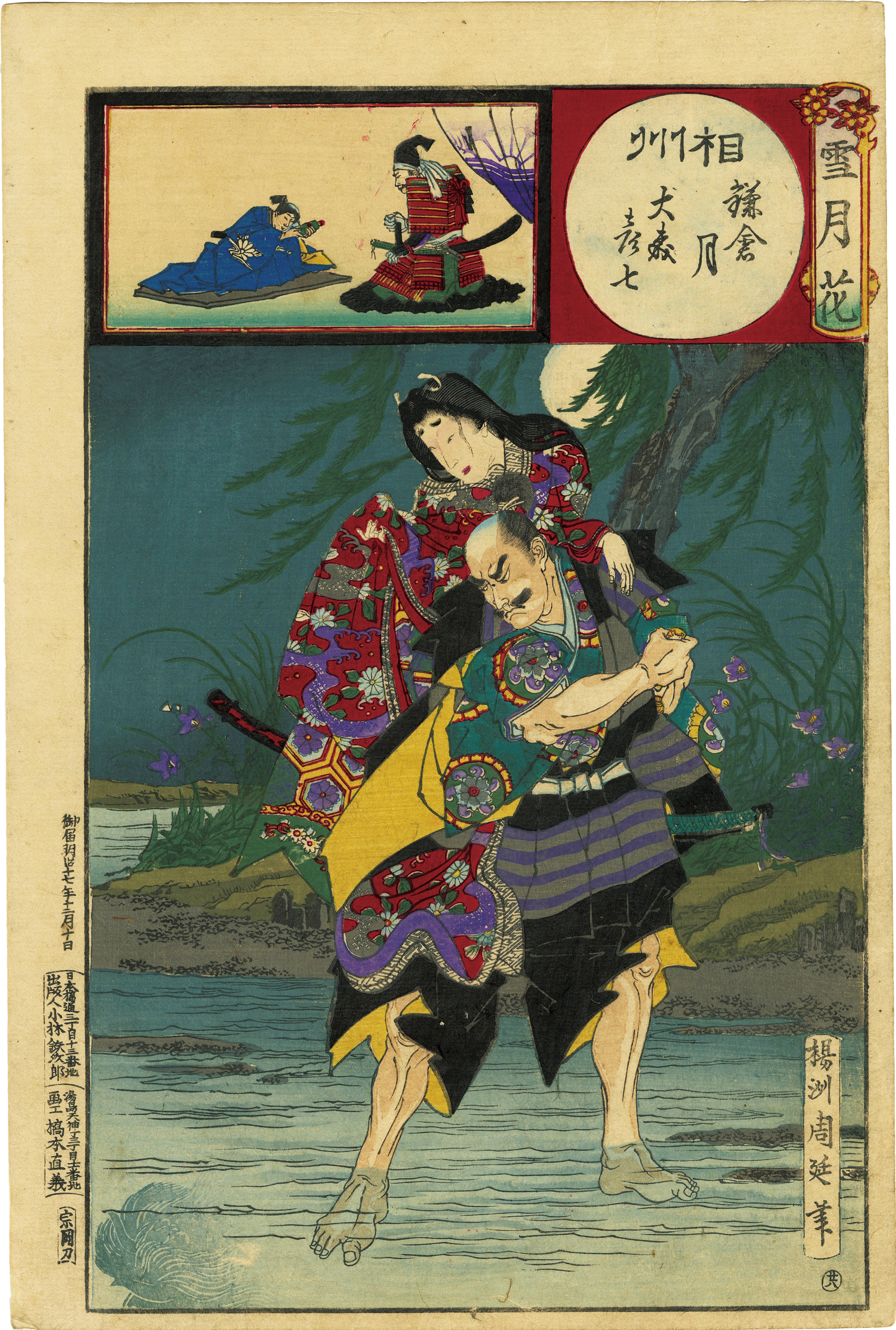 The man carrying a woman across the river is Omori Morinaga, a warlord from the Northern and Southern Dynasties period, also known as Hikoshichi.
