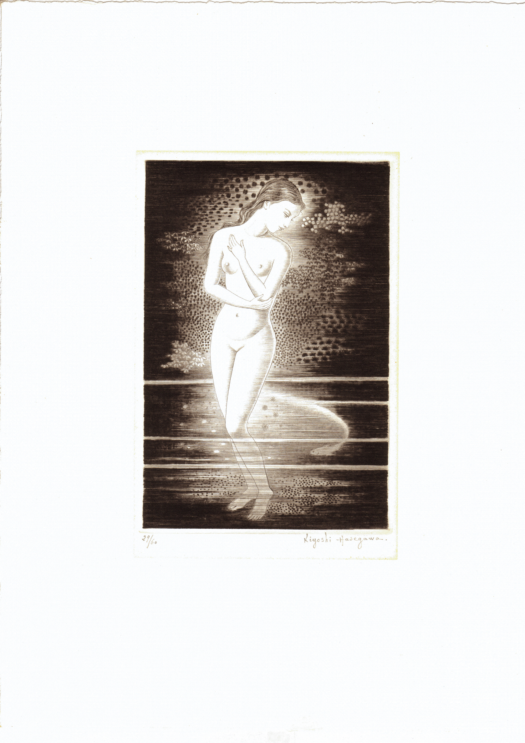 The girl emerges from the darkness, with a fish playfully swimming around her feet. The featured work is a reworked version of a similar piece created in 1925, and was re-produced in 1971. While the composition in the earlier work depicted only the girl up to her knees, the featured work shows the full figure, with a more detailed background. Additionally, this piece is the last known work by Hasegawa Kiyoshi with a confirmed production date, as he did not produce any new works after the loss of his skilled printer. (Note: "point-seché" and "drypoint" are synonymous.)