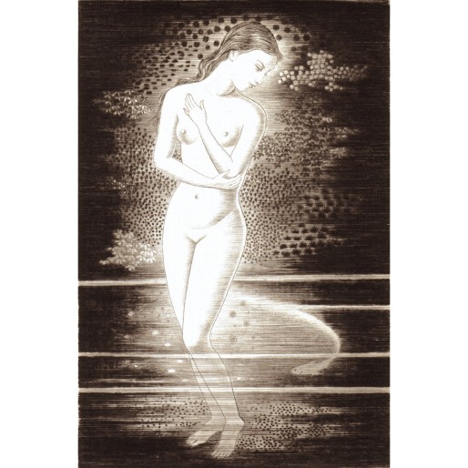 暗闇に浮かび上がる少女像。その足下には一匹の魚がじゃれつくように泳いでいる。掲載作品は、1925年に制作された類似の作品の後、1971年に改めて制作されたものだ。初期の作品においては膝下あたりまでであった構図は、掲載作品では少女の全身となり、背景にも手の込んだ表現が確認できる。また、練達の刷師を失って以後、新作を制作することのなかった長谷川潔にとって、制作年の確認できる作品なかでは最後のものとなっている。