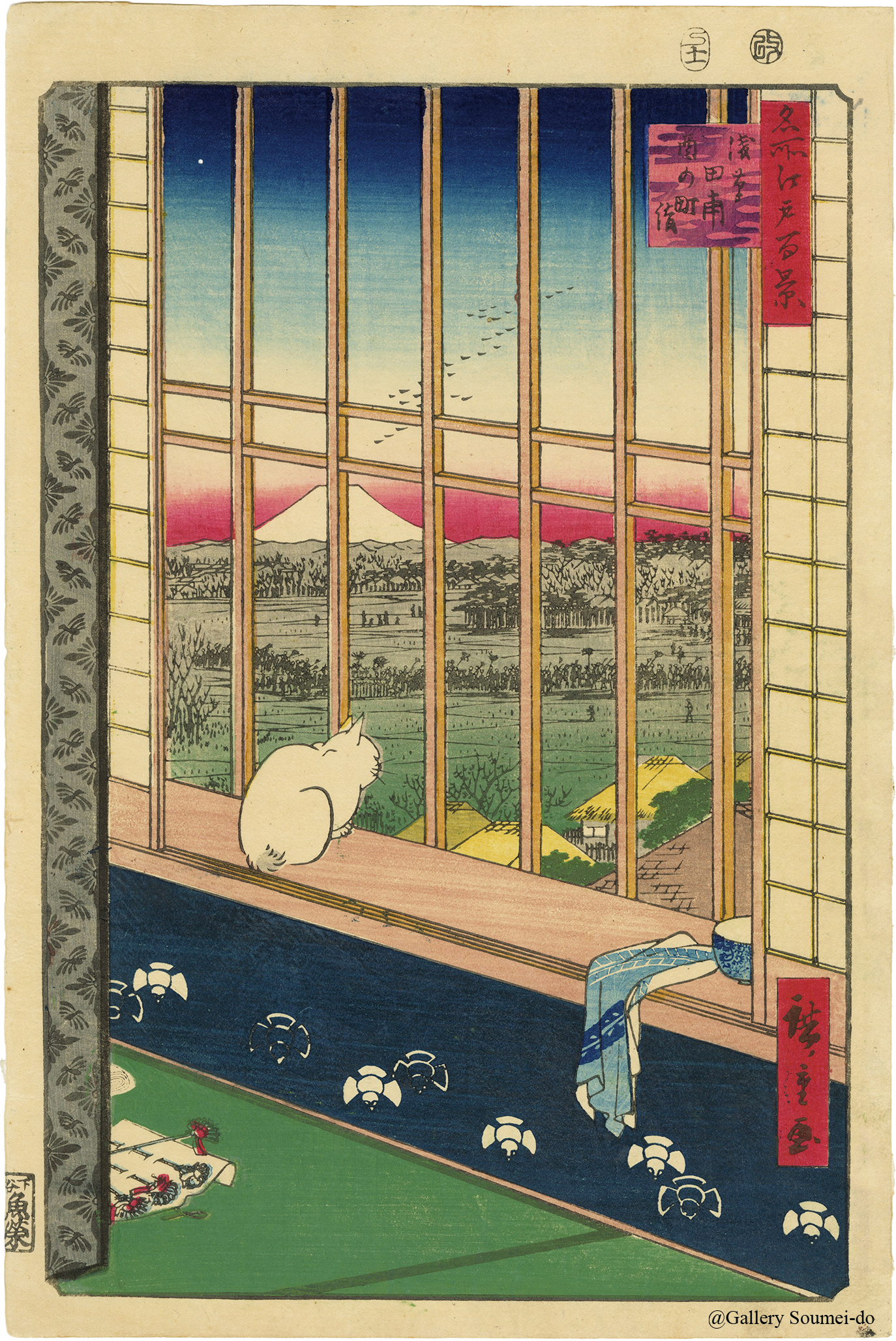The hit series of Ukiyo-e "One Hundred Famous Views of Edo", first published from 1856-1859, including several of the Ukiyo-e masterpieces by Hiroshige. Hiroshige began this project at the age of sixty, and in it, captured many charming scenes of the Edo era through very original, vertically-arranged compositions. Though he intended to create 100 images in the beginning, the overwhelming popularity of this series led the artist to produce a total of 118 prints over 3 years.