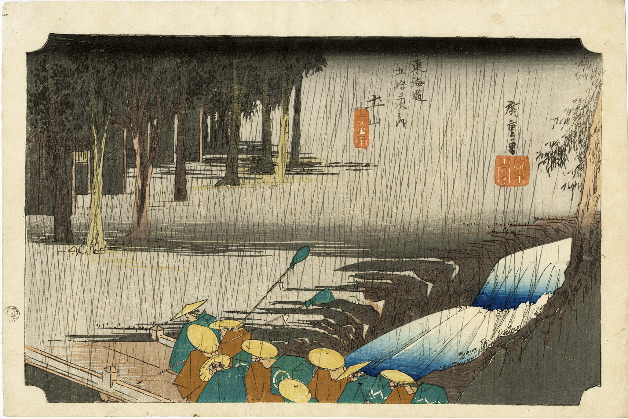 当時保永堂はまだ新興の版元で、新しい表現に燃え、エネルギーに満ちあふれていた。広重もそれに触発されてか、意欲的に制作に取り組み、自身の体験をもって臨場感ある豊かな作品に仕上げた。