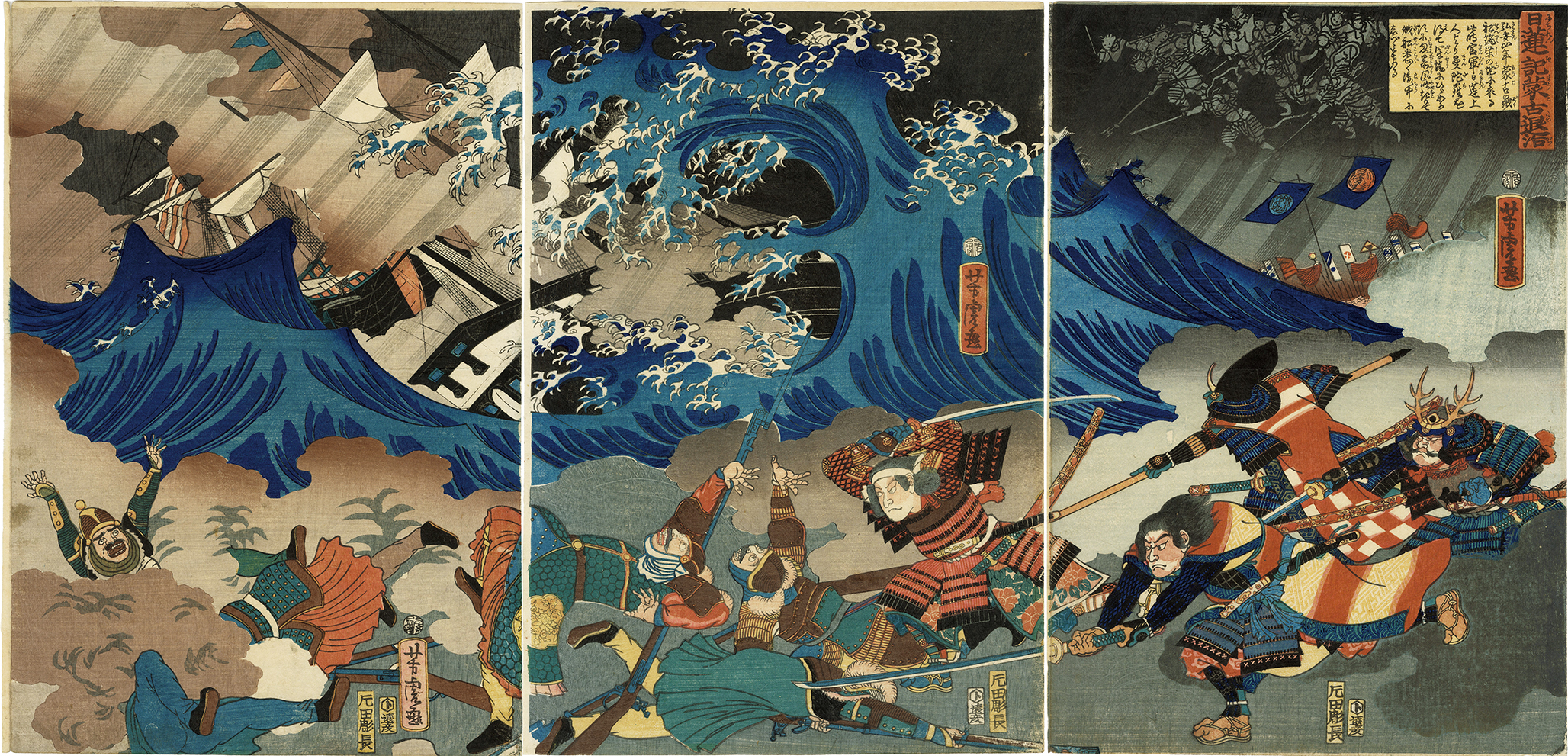 A powerful triptych depicting the battle against the Mongols. The stormy sea in the background amplifies the intensity of the conflict.