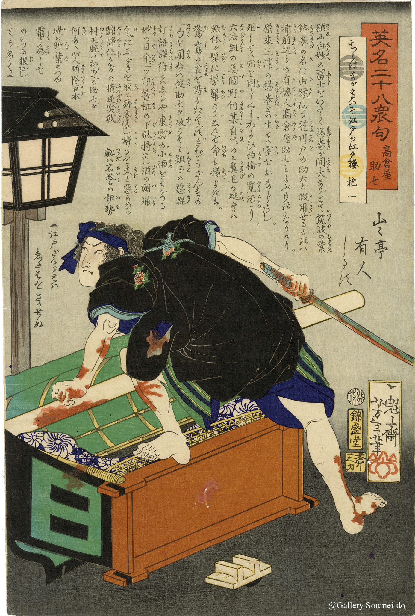 The year of creation was 1866 to 1867. The majority of the pieces take subjects from the play and are considered the pinnacle of Muzan-e, Ukiyo-e with cruel motifs.