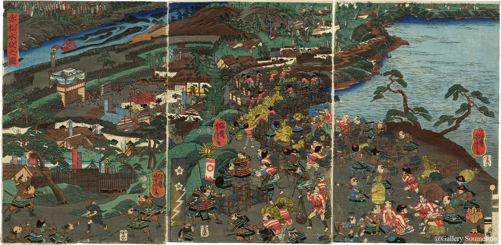 Yoshitora, a disciple of Kuniyoshi, was one of the leading artists active from the late Edo period into the Meiji period. He was especially known for his Yokohama-e and Kaika-e, which depicted the novel customs and fashions emerging around the Meiji Restoration. His works included numerous depictions of foreign landscapes unfamiliar to most Japanese of the time.