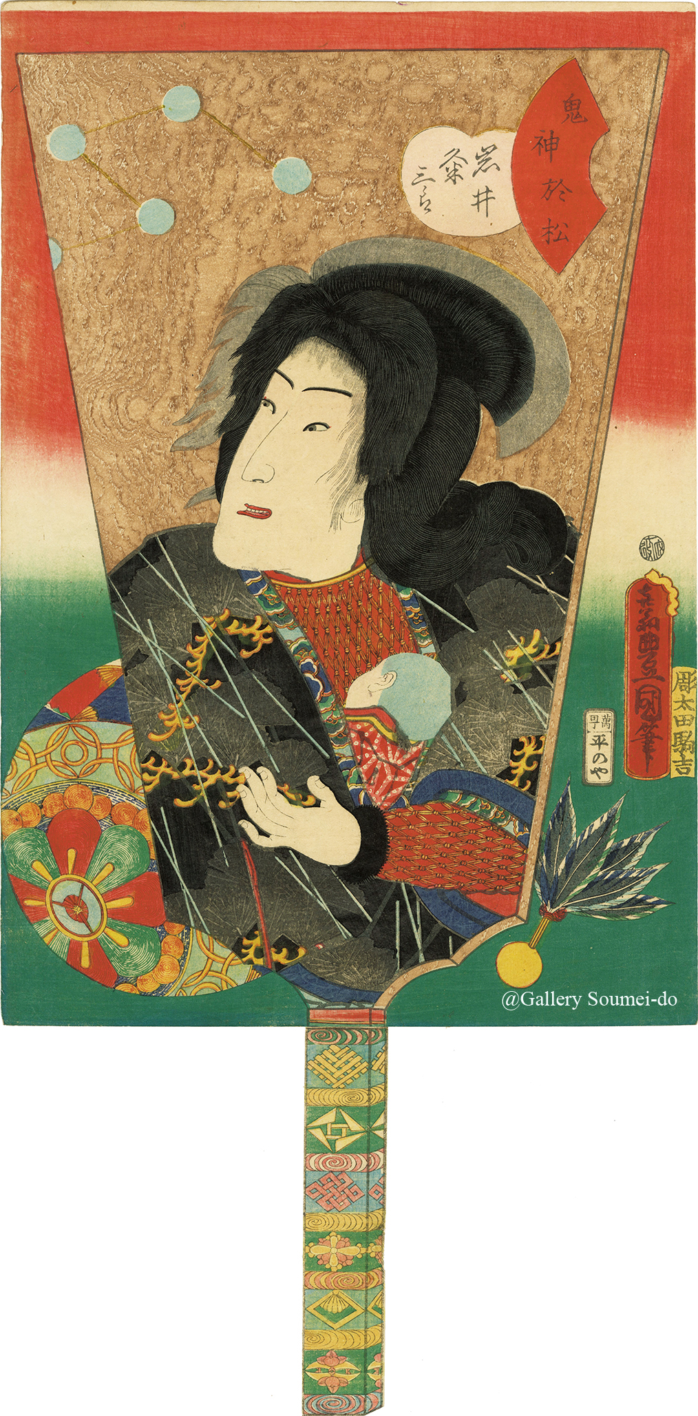 This work is designed in the form of a hagoita (battledore). Only early impressions include the handle portion of the hagoita design.