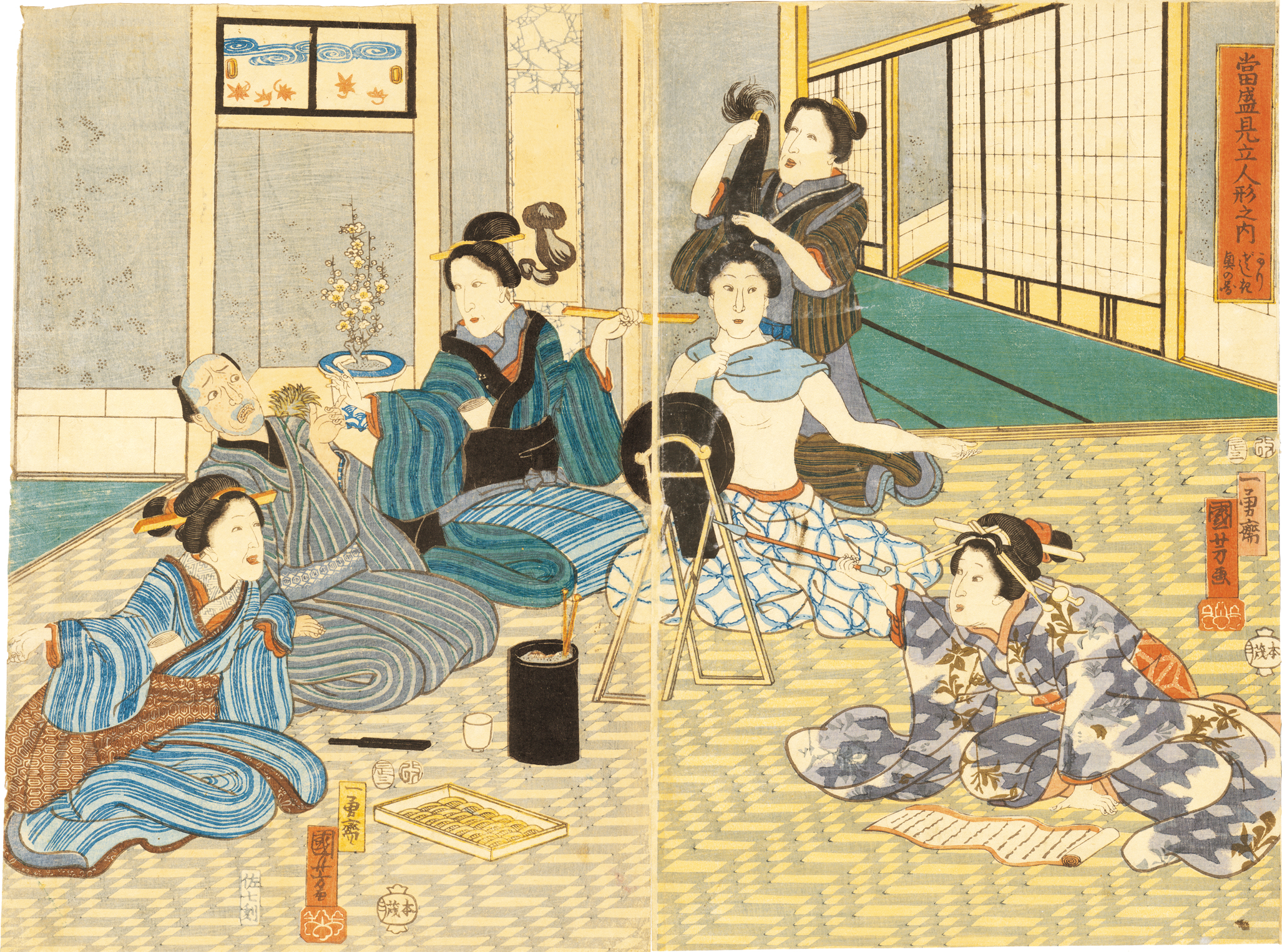 This print illustrates carved dolls displayed at Kannon Temple in Asakusa. These lifelike dolls were in fact extremely realistic life-sized clothed statues.